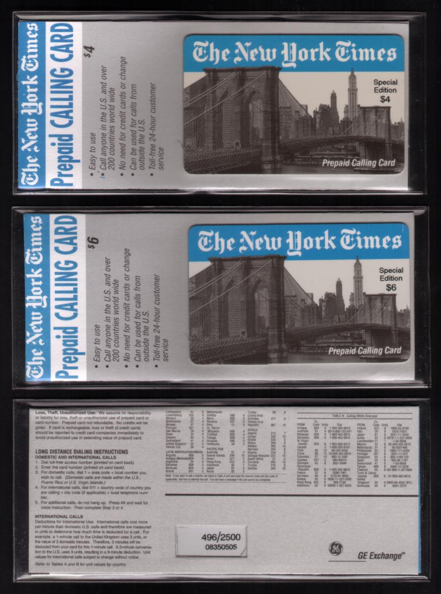 These cards are a set of collectible sightseeing prepaid calling cards issued in collaboration with The New York Times, featuring a scenic and iconic New York City landmark. They are part of a sealed two-card set.
