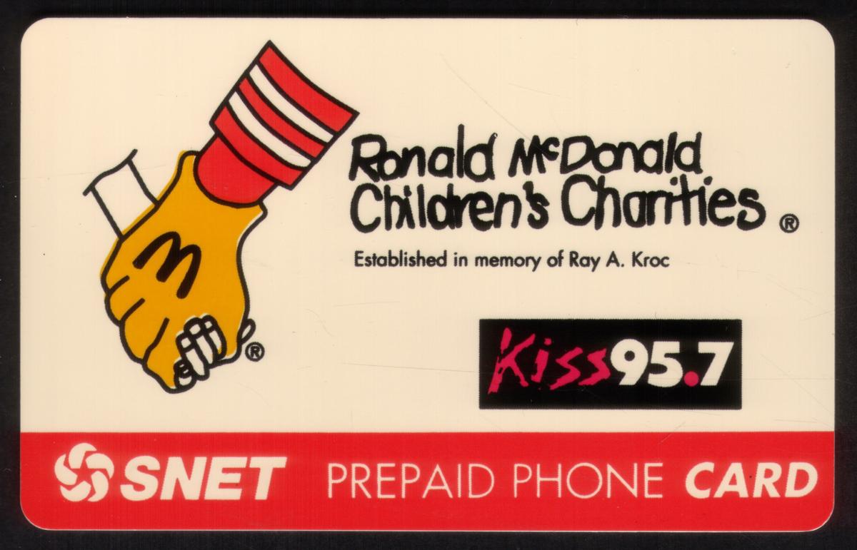 Prepaid phone card featuring Ronald McDonald Children’s Charities logo, handshake image, Kiss 95.7 logo, and SNET branding, symbolizing charity, community, and telecommunications. |