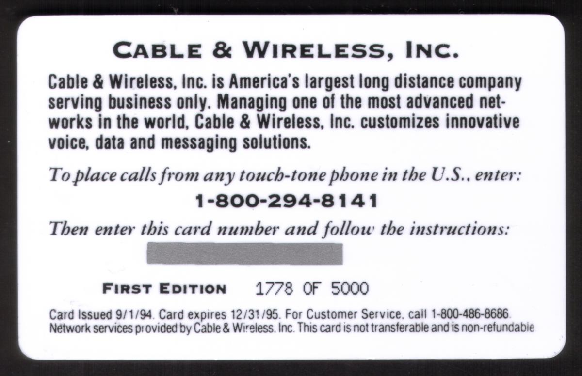 In the upper left corner of each card is the Cable & Wireless, Inc. logo, which consists of a white globe icon rendered with horizontal lines and a slight wave effect. Below the logo is the tagline "Architects of Business Communications" in a white italic serif font. The bottom right corner of each card contains the phrase "First Edition" in red italic script.