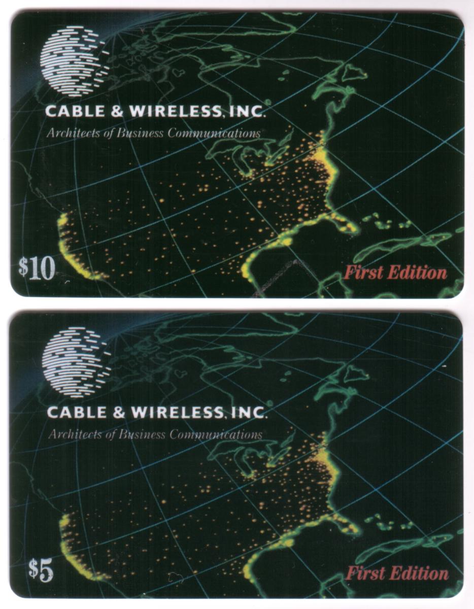 These are two collectible promotional phone cards issued by Cable & Wireless, Inc., featuring a stylized nighttime map of North America. The design highlights the eastern part of the United States with numerous illuminated points representing city lights or communication nodes. The map is set against a grid and dark background, giving it a global telecommunications theme.