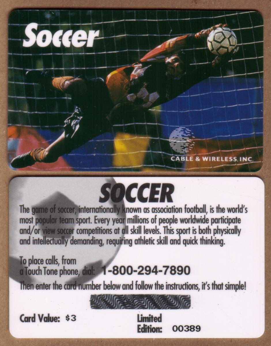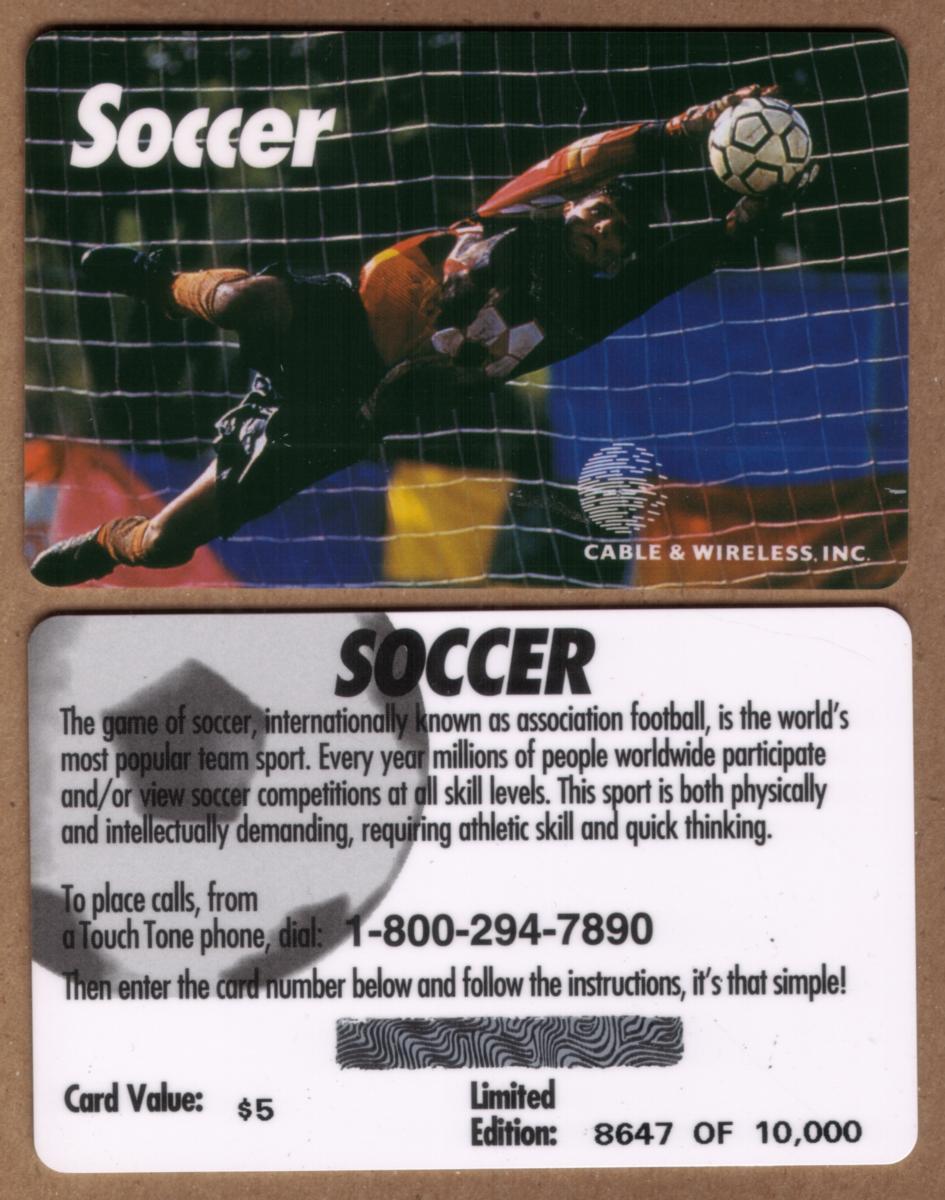This set includes two cards identical in image and design, both representing the sport of soccer with an emphasis on the goalie’s skill. The cards are associated with Cable & Wireless and pertain to a set showcasing soccer goalkeepers catching the ball.