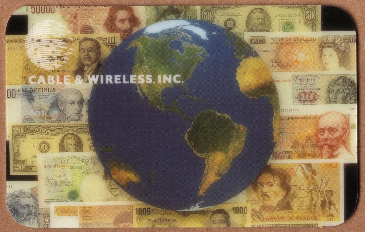 This specimen card serves as a unique collectible celebrating global currencies and the international scope of Cable & Wireless, Inc., symbolized through the combination of the Earth’s image and an array of diverse banknotes from various nations.