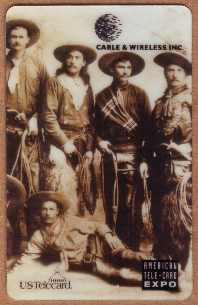 This Telecard commemorates the Tele-Card Expo event and is part of a series featuring historical Western themes, combining telecommunication memorabilia with classic cowboy iconography. The involvement of Cable & Wireless (CWI) is noted prominently, connecting the card to a major telecommunications company during the period.