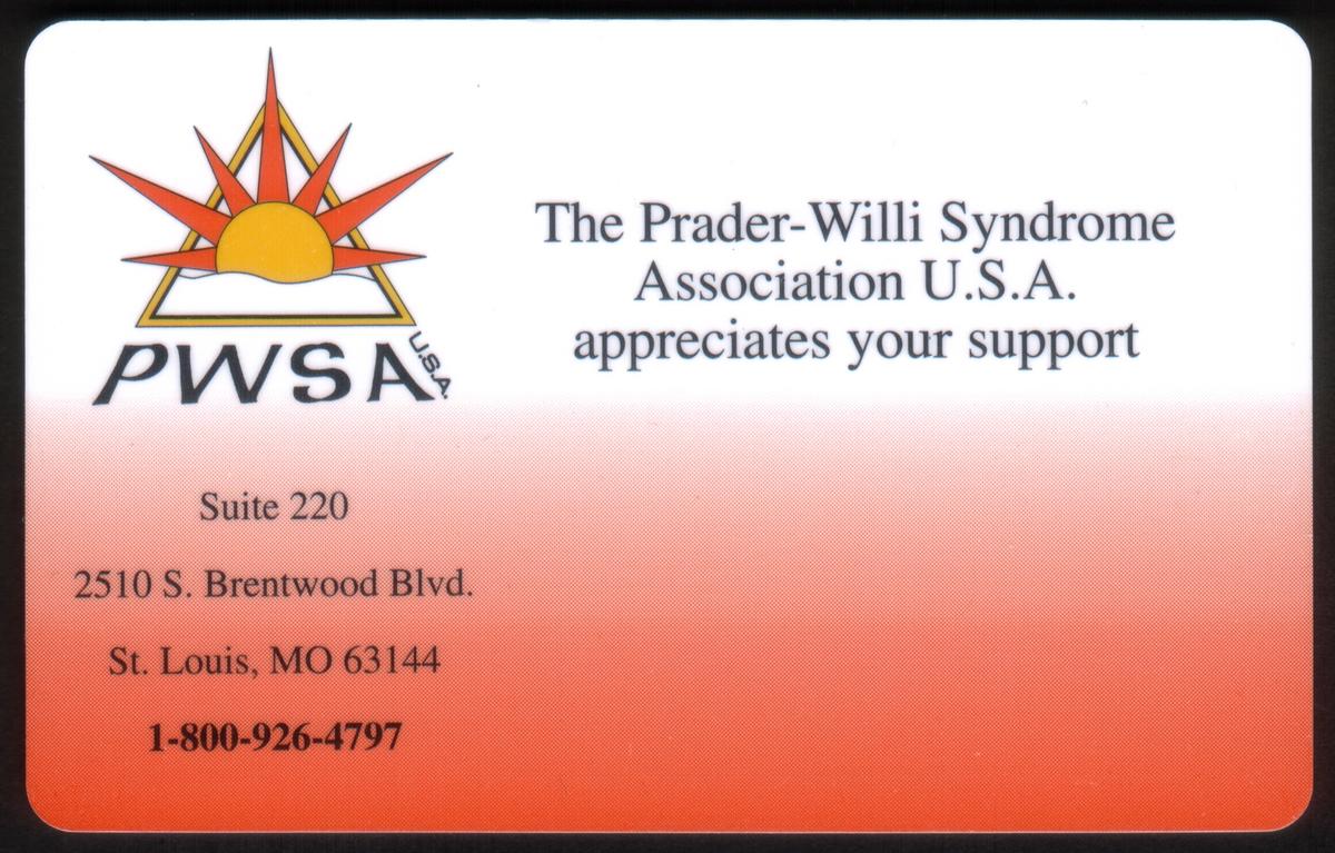 This collectible phone card is dedicated to the Prader-Willi Syndrome Association (PWSA) fundraiser based in St. Louis, Missouri. The card prominently features the logos of the Prader-Willi Syndrome Association and Cable & Wireless (CWI). The value of the card is $10, as indicated on the front. The design includes imagery of a sunrise, suggesting morning light with warm colors and a natural horizon.