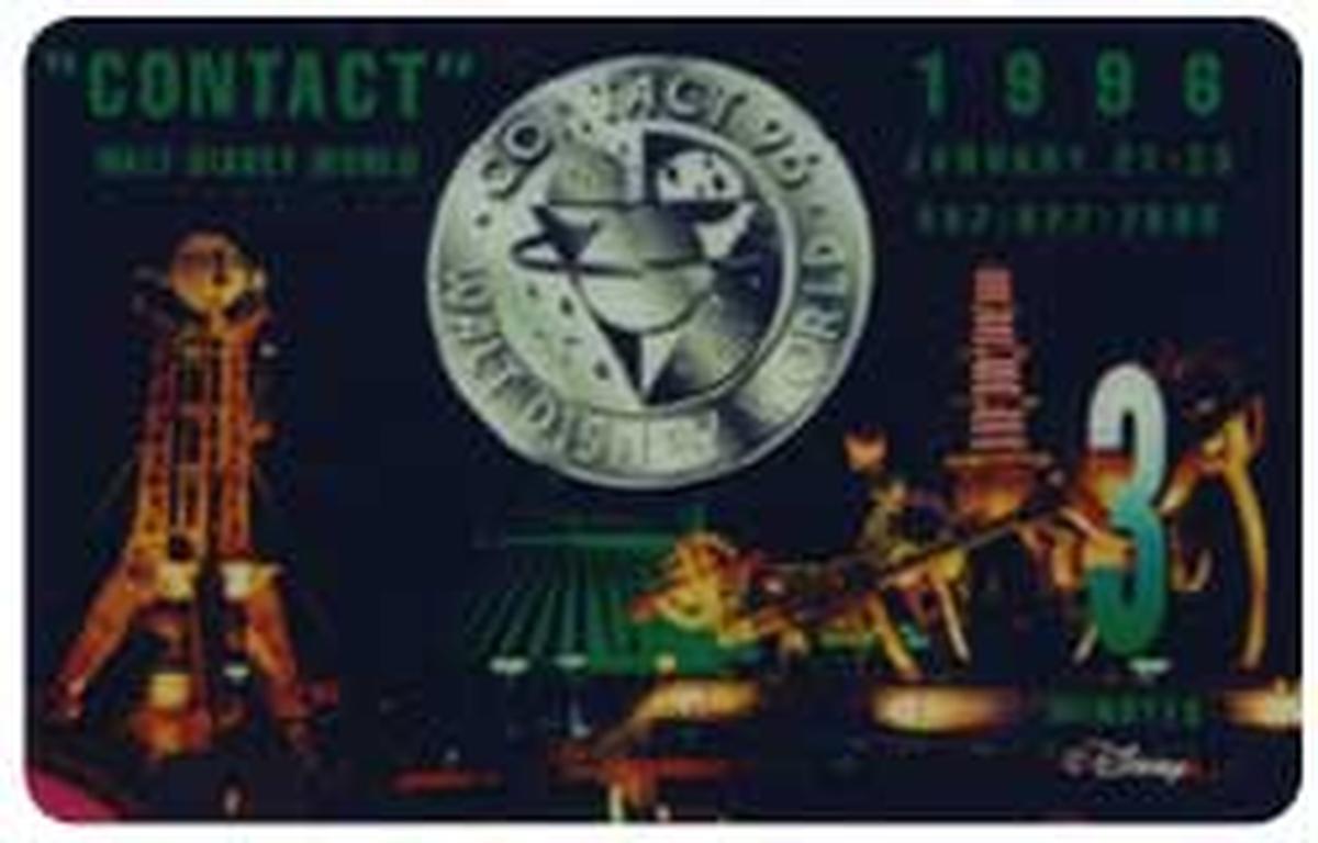 This card is a specimen example from the “Contact 96” series, which relates to collectible phone cards or chip cards distributed as memorabilia or promotional items tied to Walt Disney World and Walt Disney Land. The design and logos are printed clearly, demonstrating the connection to Disney’s brand and parks without additional textual or graphic information beyond what is stated.