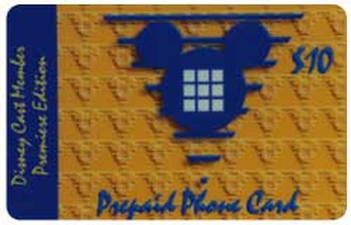 This collectible card is a Walt Disney World and Walt Disney Land Premiere Cast Member Disney Card issued by Vista-United. The front of the card features the iconic Mickey Mouse ears silhouette prominently displayed as part of the design. The text on the card reads "$10 Premiere Cast Member Disney Card," indicating its value and purpose. The card is primarily themed around Disney’s theme parks, attractions, and animation heritage, with clear references to Mickey Mouse, one of Disney's most famous characters.