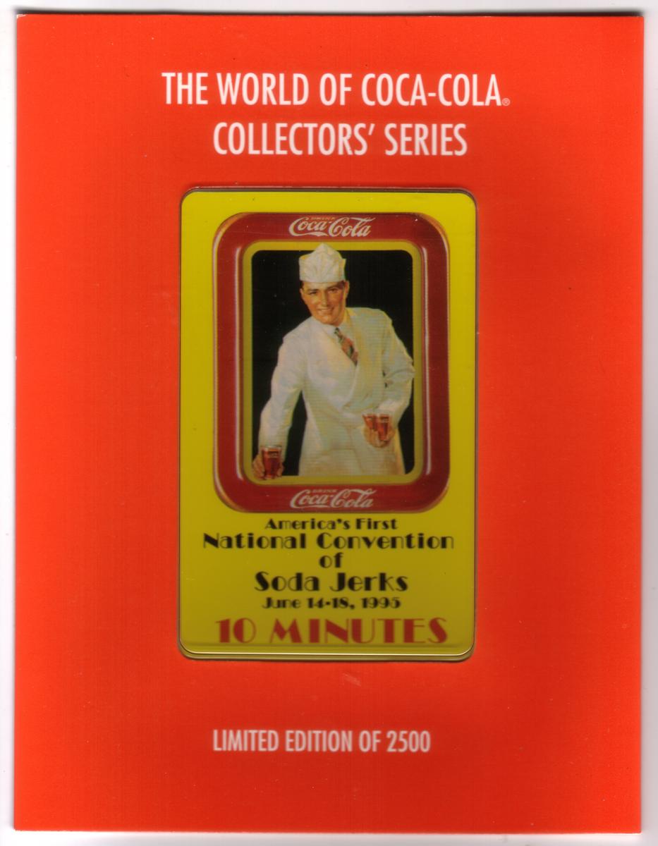 This item is related to the World of Coke and features Coca-Cola logos and branding. It was issued by The Score Board Inc. and is associated with the Soda Jerk Convention, making it a collectible phone card that celebrates this nostalgic segment of American soda fountain history.