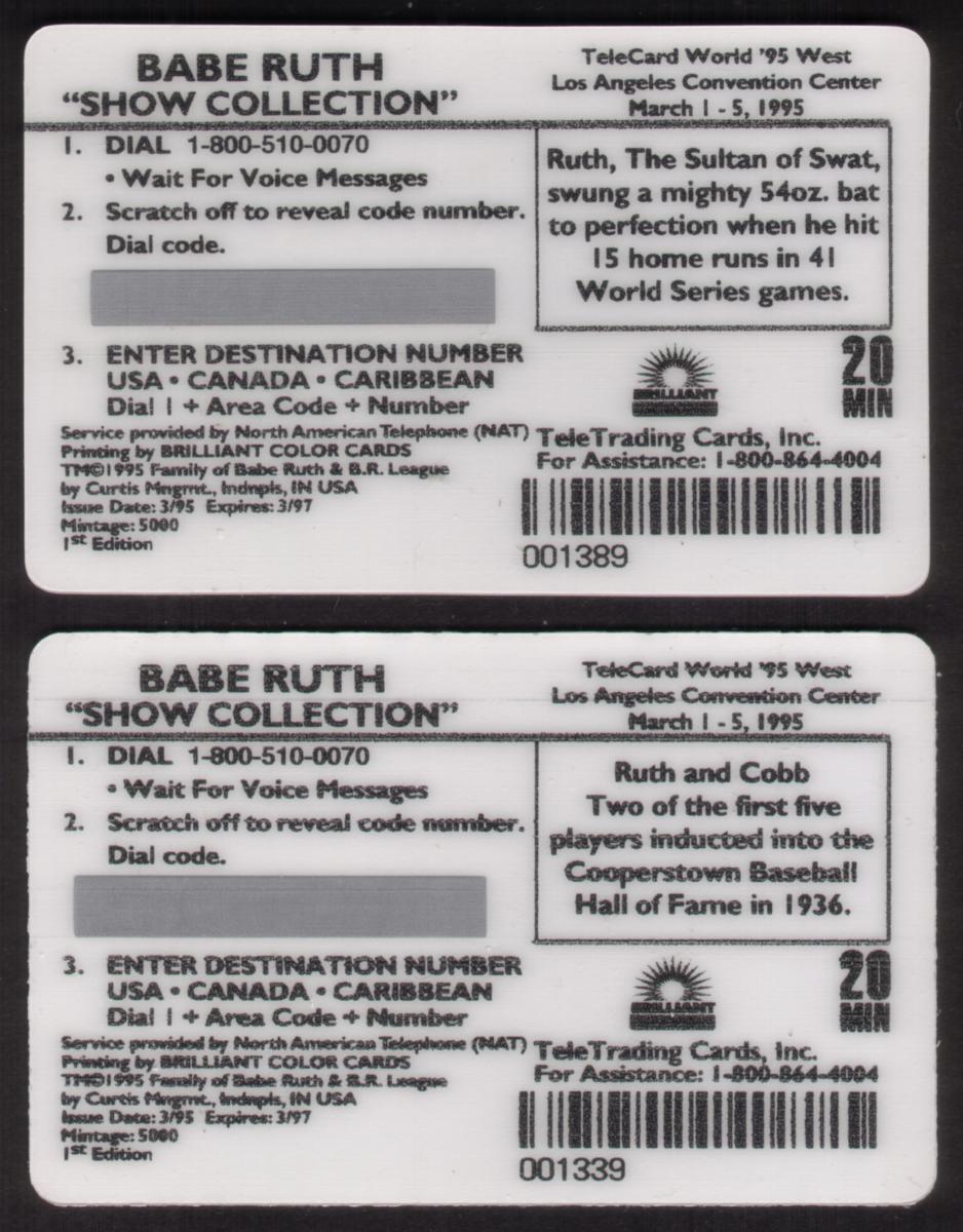 This set of two collectible TeleTrading cards features iconic baseball legends Babe Ruth and Ty Cobb, capturing moments from the early era of professional baseball. Each card is marked with "20 Min TeleTrading Card" at the top and includes the "Babe Ruth Show Collection" title at the bottom in gold text.