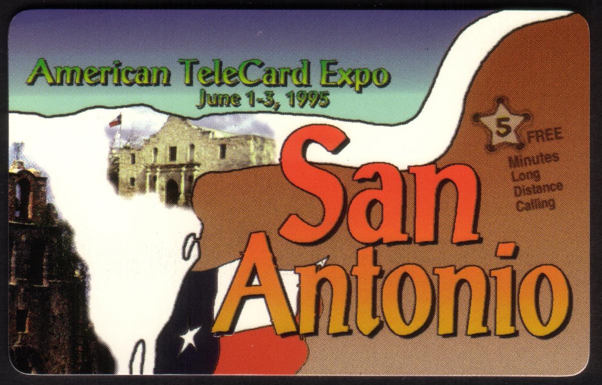 Above the image, "American Tele-Card Expo" is printed along with the date “6-95” and location “San Antonio TX,” clearly marking the event and place it celebrates. The card also includes graphical elements representing various Texas state flags, evident by the distinctive stars and stripes arranged in a horizontal band below the event text. The Texas state flag is seen among these, reinforcing the regional pride connected with this collectible.