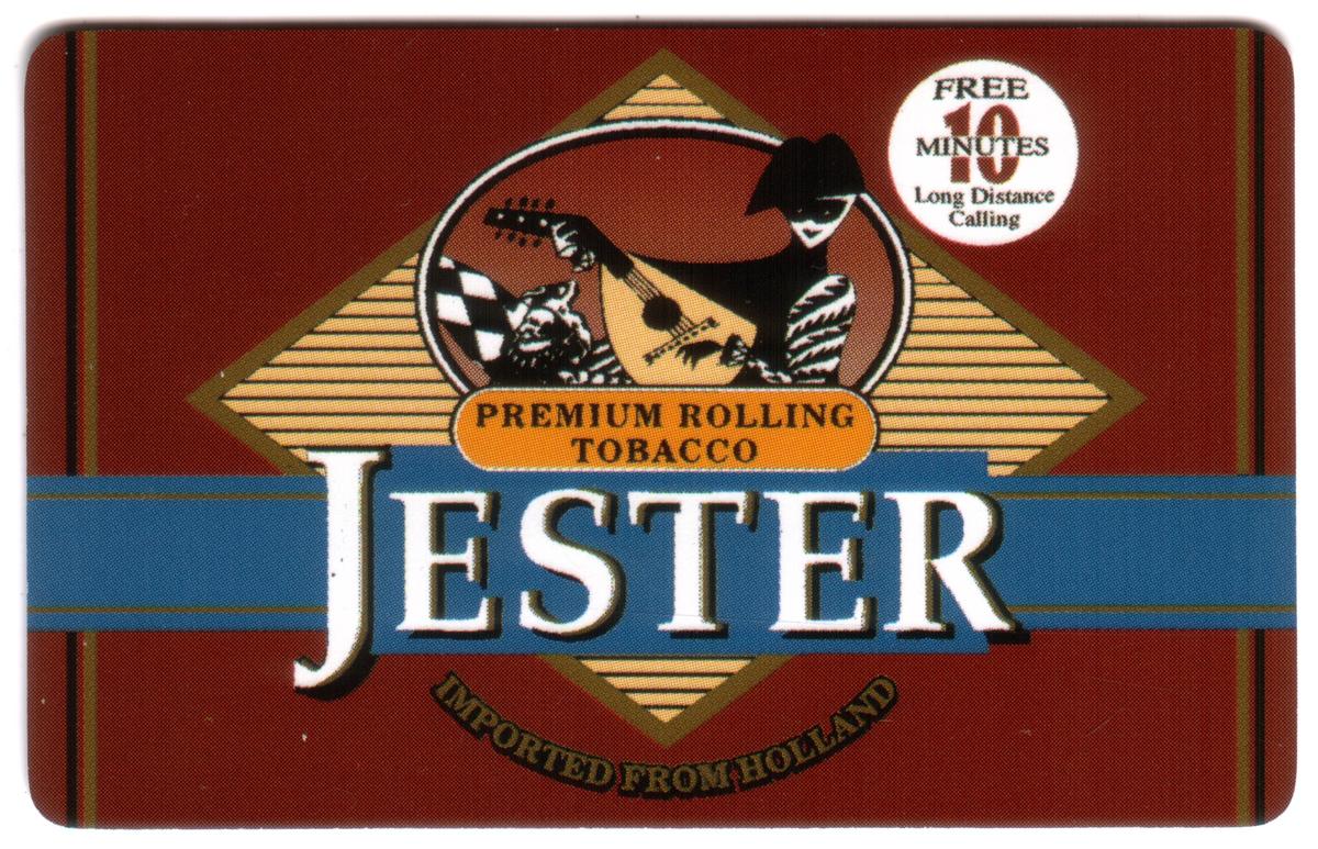 This item is a promotional phone card issued by WorldCom. The card’s focus is on advertising Jester Premium Rolling Tobacco, reflecting its use as a communication tool tied to commercial branding. The card does not feature other characters or additional logos aside from those related to the tobacco promotion and WorldCom branding.