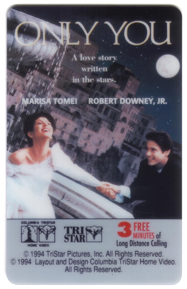 This collectible phone card features promotional artwork from the film *Only You*, a romantic movie starring Marisa Tomei and Robert Downey Jr. The card prominently displays the film's title, *Only You*, along with the names of the leading actors, Marisa Tomei and Robert Downey Jr., and the Columbia TriStar Home Video logo. The design includes a soft, dreamlike backdrop with subtle star motifs, emphasizing the movie’s theme of fate and romance.