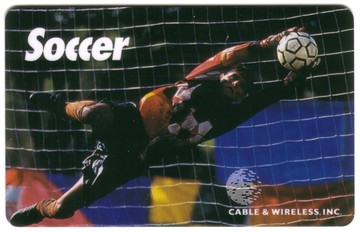 This phone card is dedicated to soccer, highlighting a key moment involving a goalie catching the ball during play. The design focuses on the sport’s intensity and the goalie’s skill, with vibrant colors and clear text referencing soccer in multiple languages.