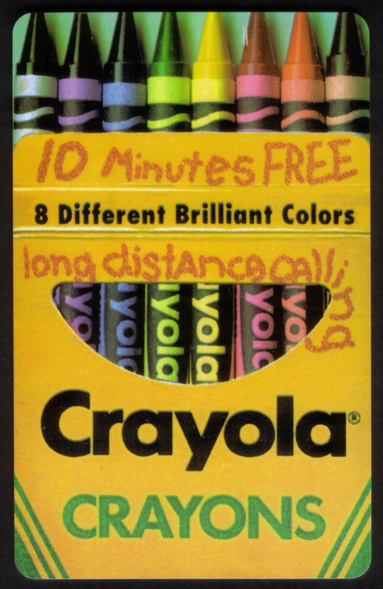 This collectible phone card features a design inspired by a Crayola Crayons box, showcasing eight different vibrant crayon colors arranged vertically at the top of the card. The crayons have black paper labels with the word "Crayola" printed on each in white text. The card's background is primarily yellow with green accents at the bottom portion, mimicking the classic Crayola box color scheme.