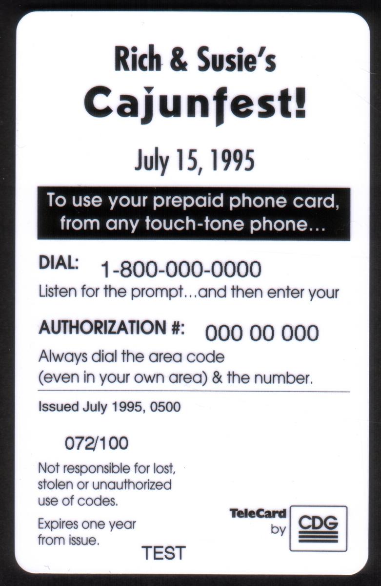 The card is part of a series related to classic advertising and corporate trademarks, using the iconic Crayola Crayons packaging to evoke nostalgia and recognition. The date July 15, 1995, and the mention of Rich & Susui's Cajunfest connect this phone card to a specific event or promotion during that period.