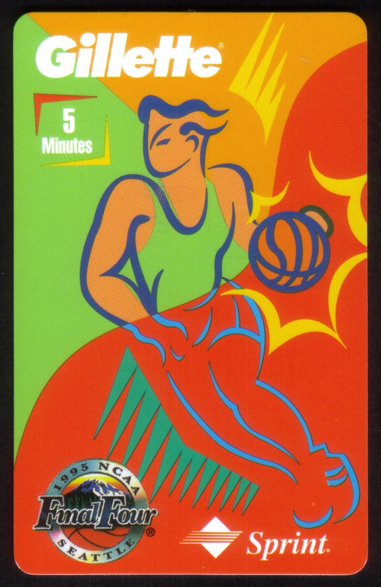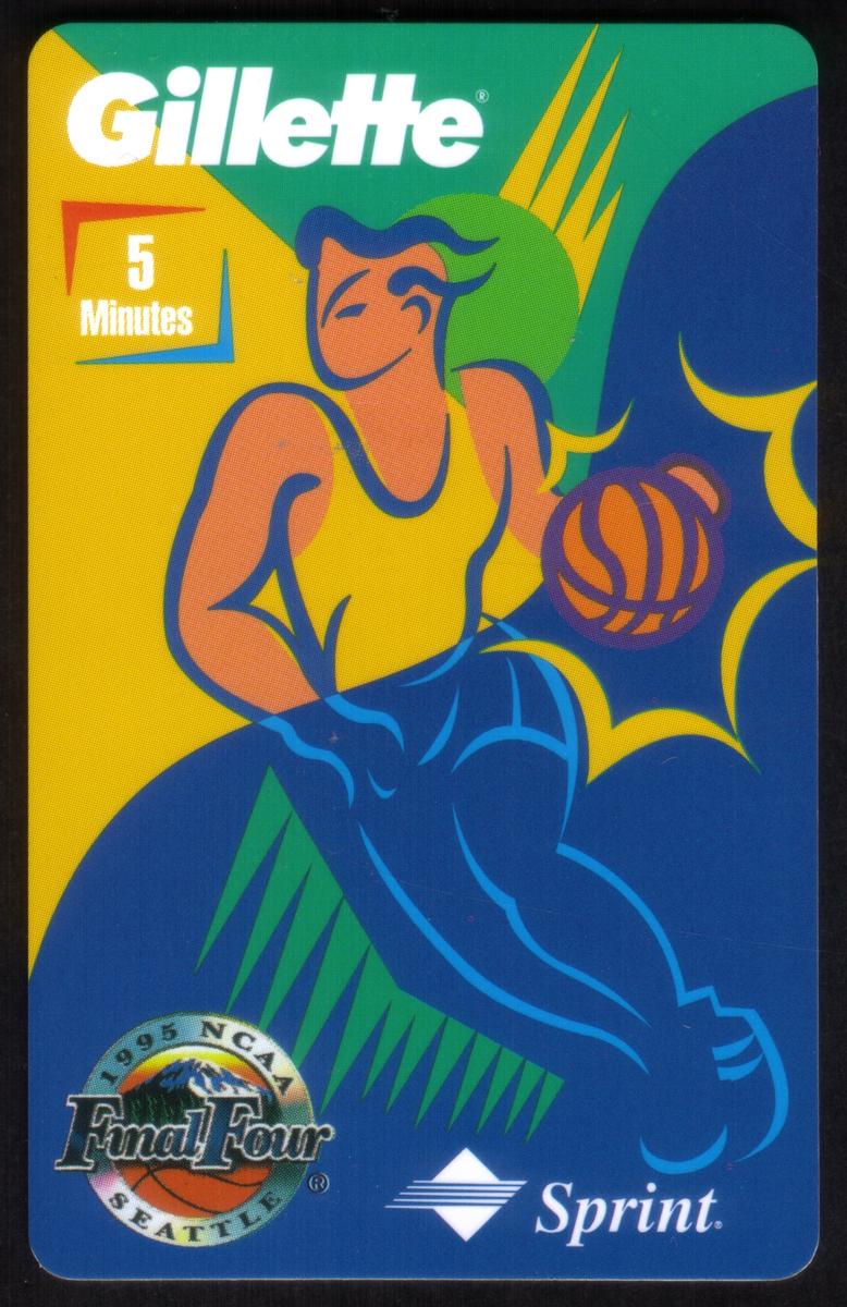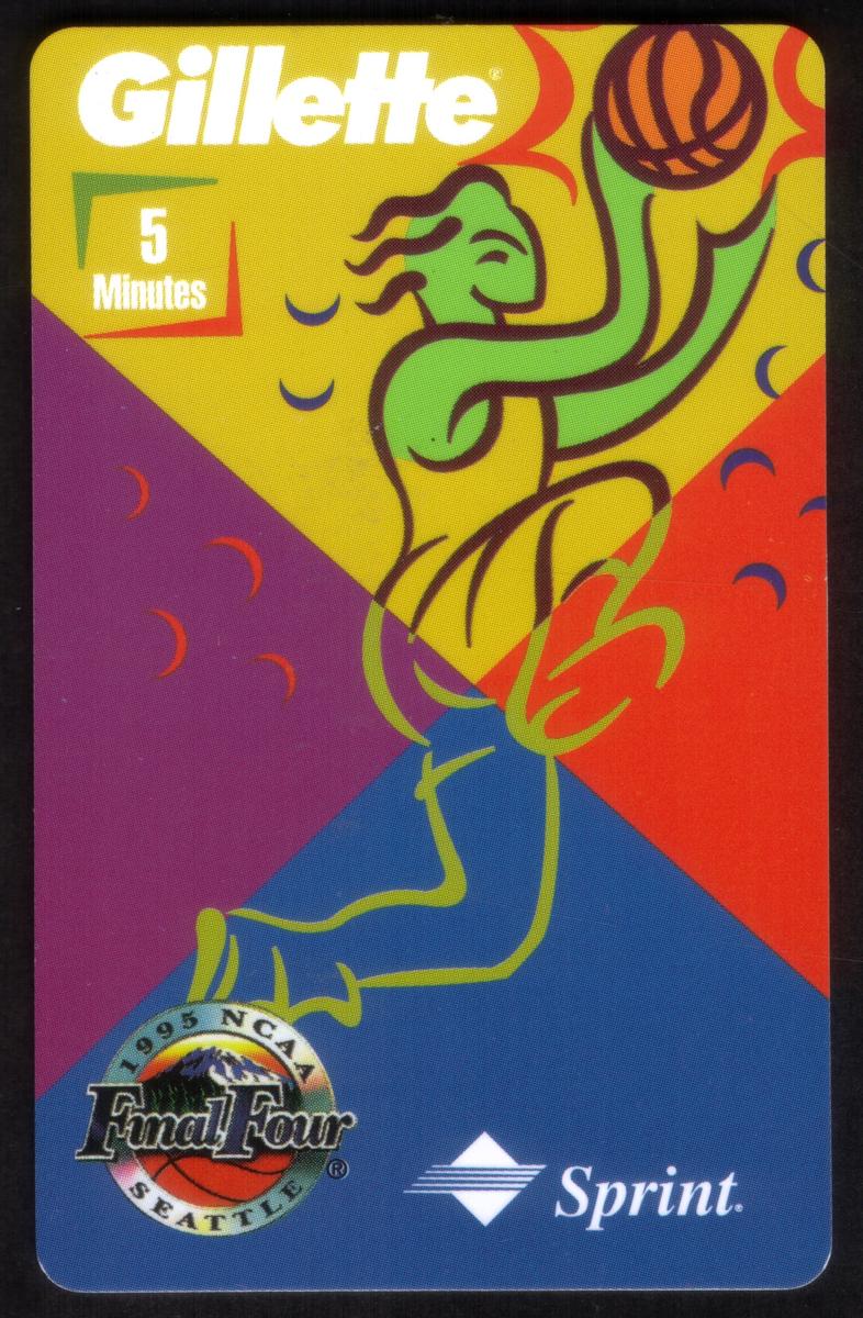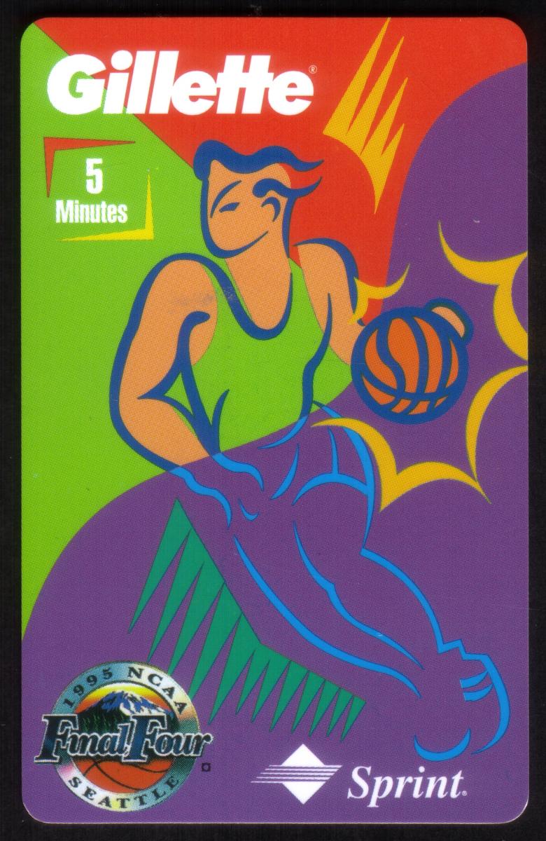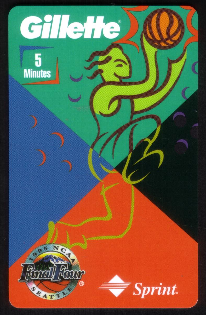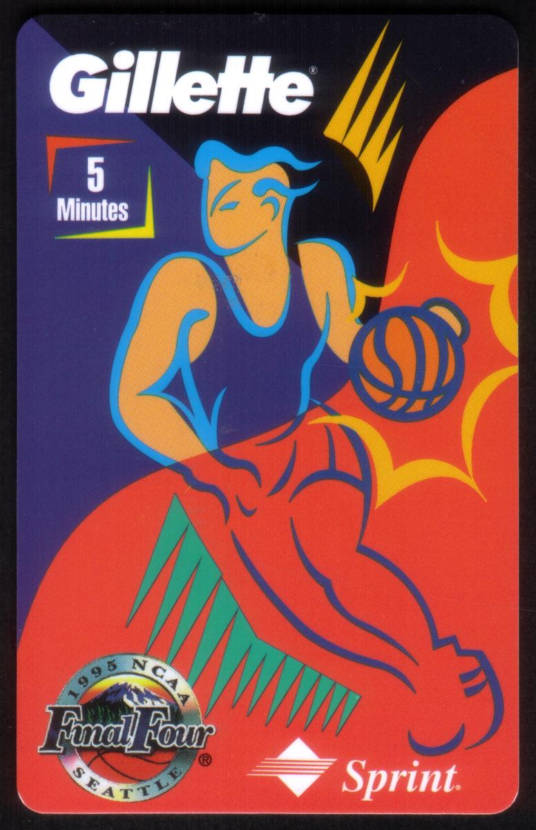Overall, the card celebrates NCAA basketball through its use of official logos, basketballs, and associated branding from Gillette and Sprint, reflecting a promotional collectible from the mid-1990s focused on college basketball.