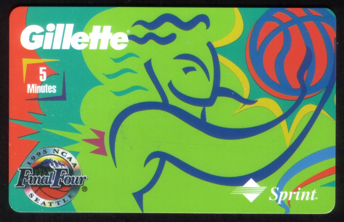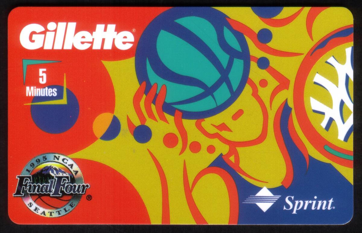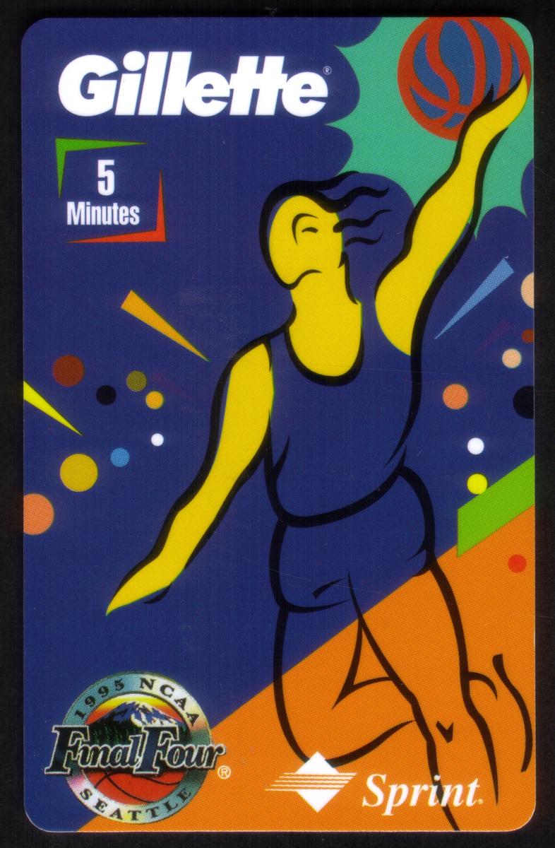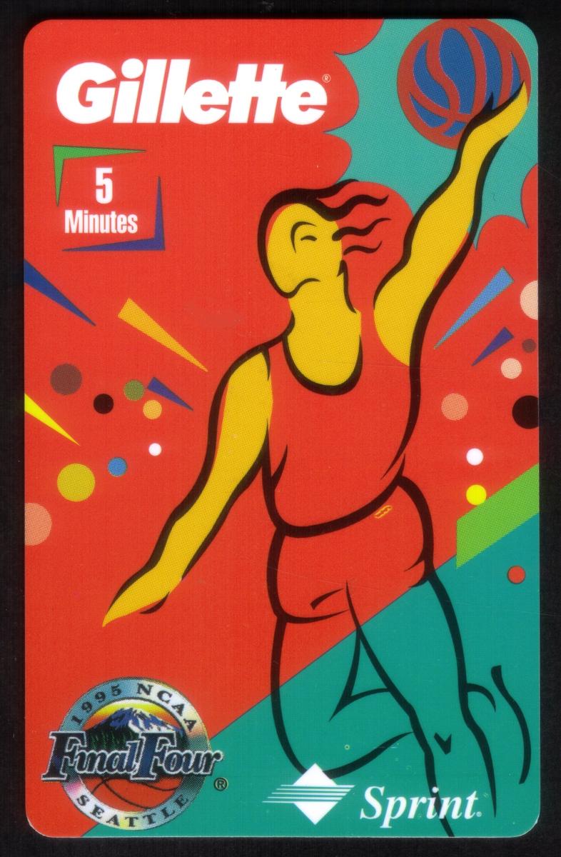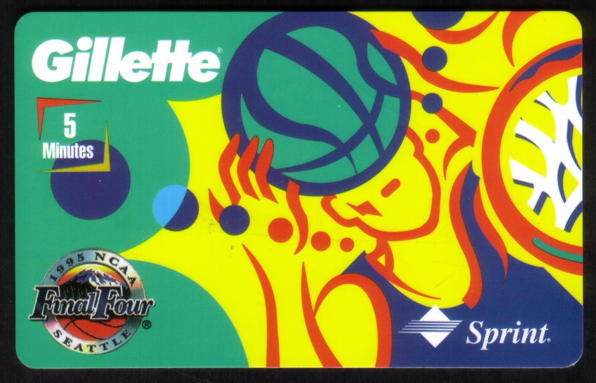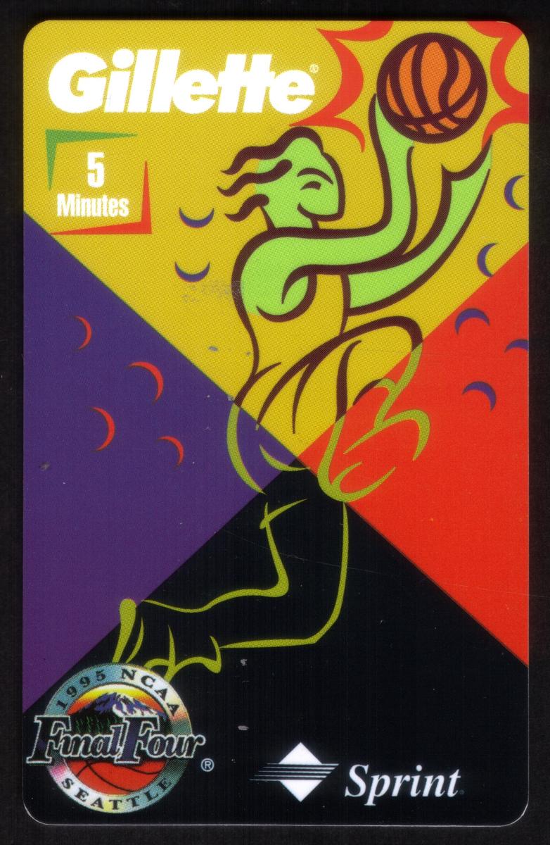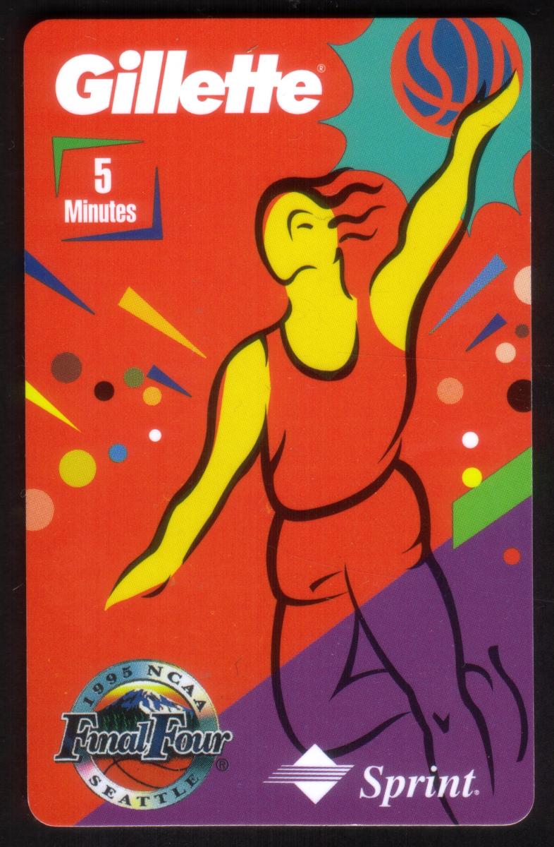 Overall, the card celebrates NCAA basketball through its use of official logos, basketballs, and associated branding from Gillette and Sprint, reflecting a promotional collectible from the mid-1990s focused on college basketball.
