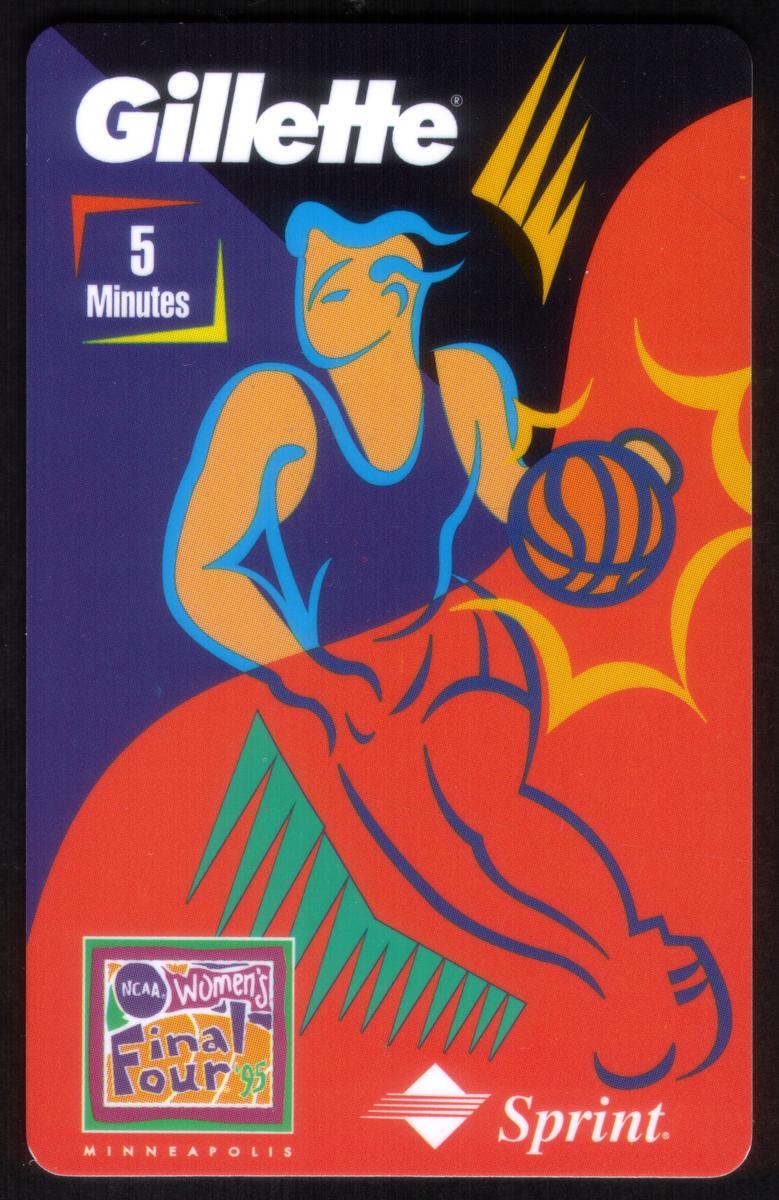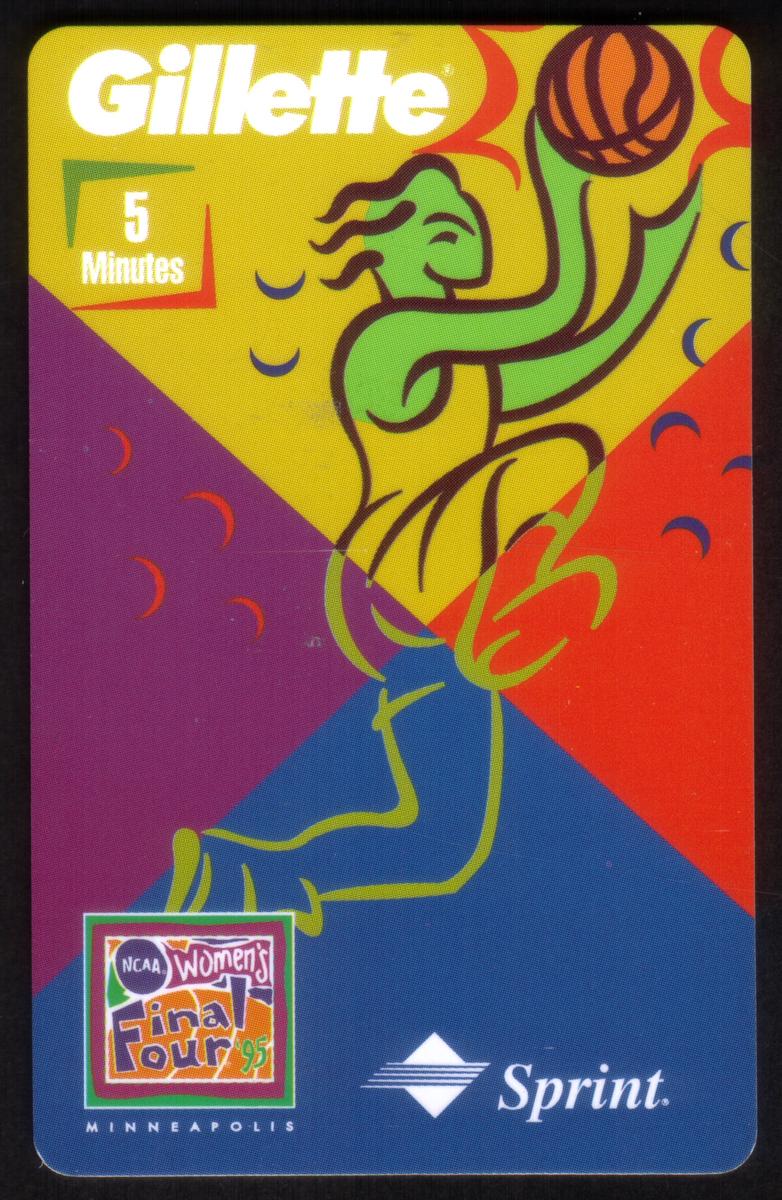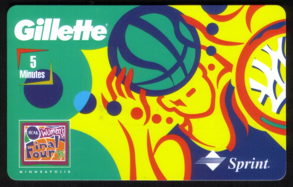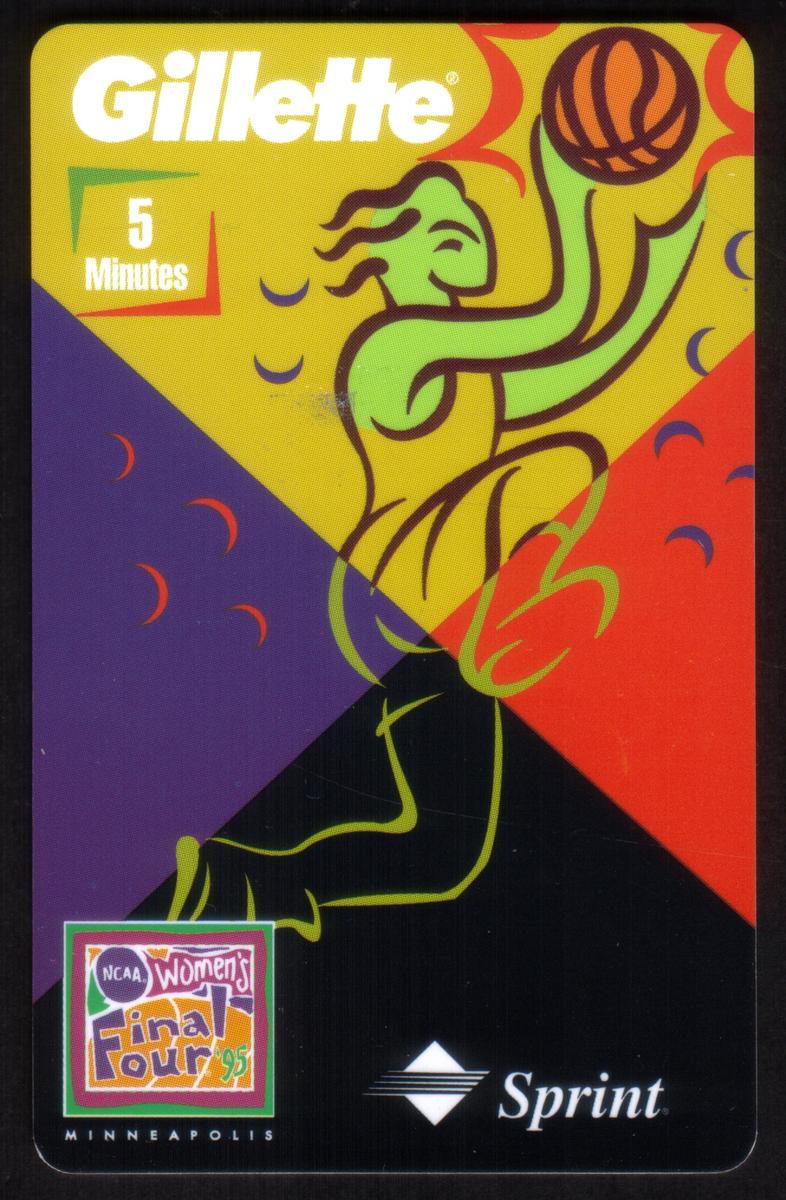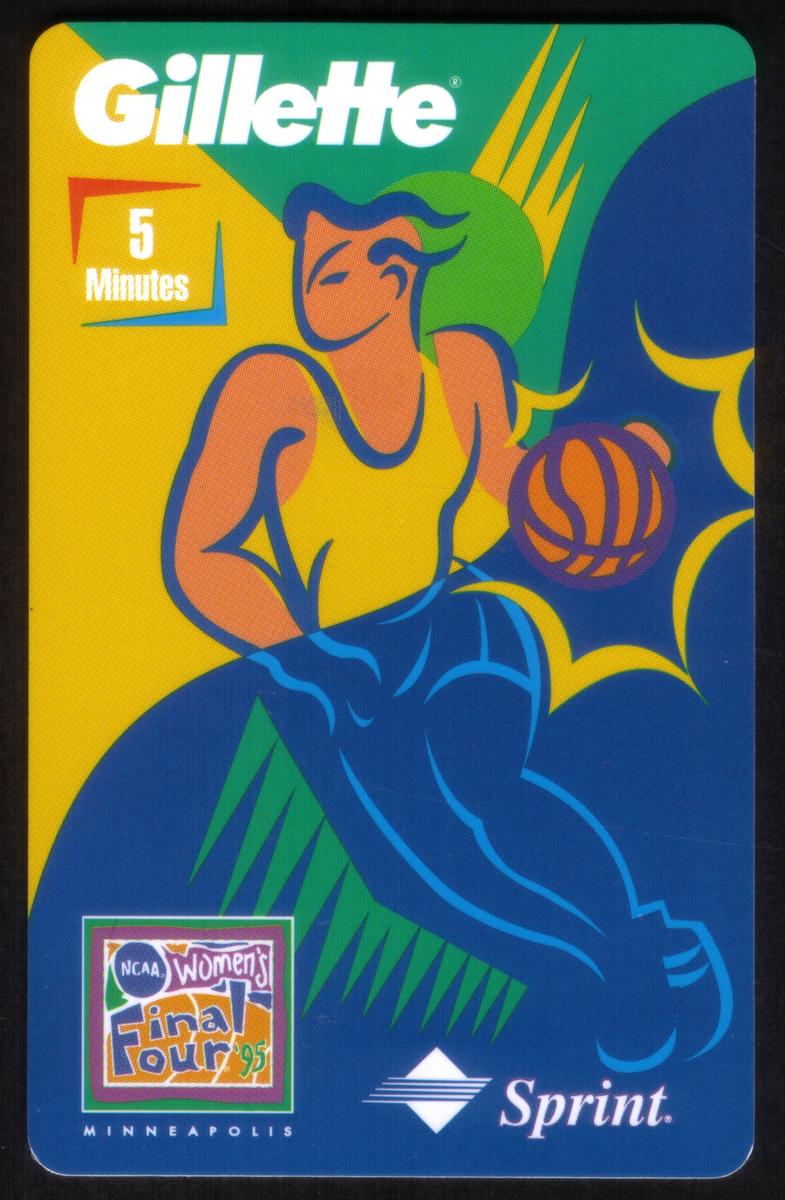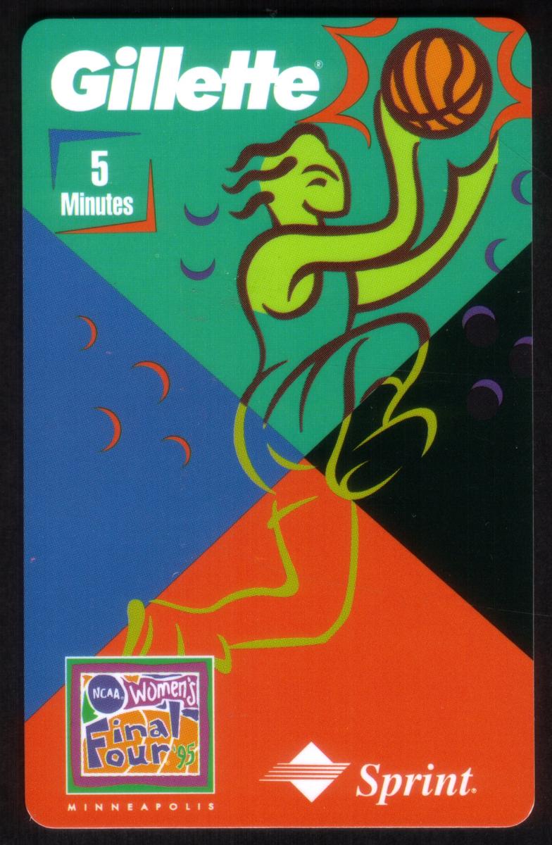 Overall, the card celebrates NCAA basketball through its use of official logos, basketballs, and associated branding from Gillette and Sprint, reflecting a promotional collectible from the mid-1990s focused on college basketball.
