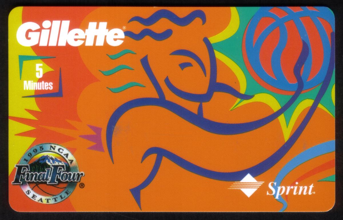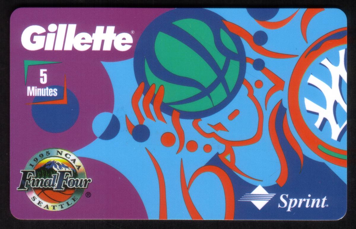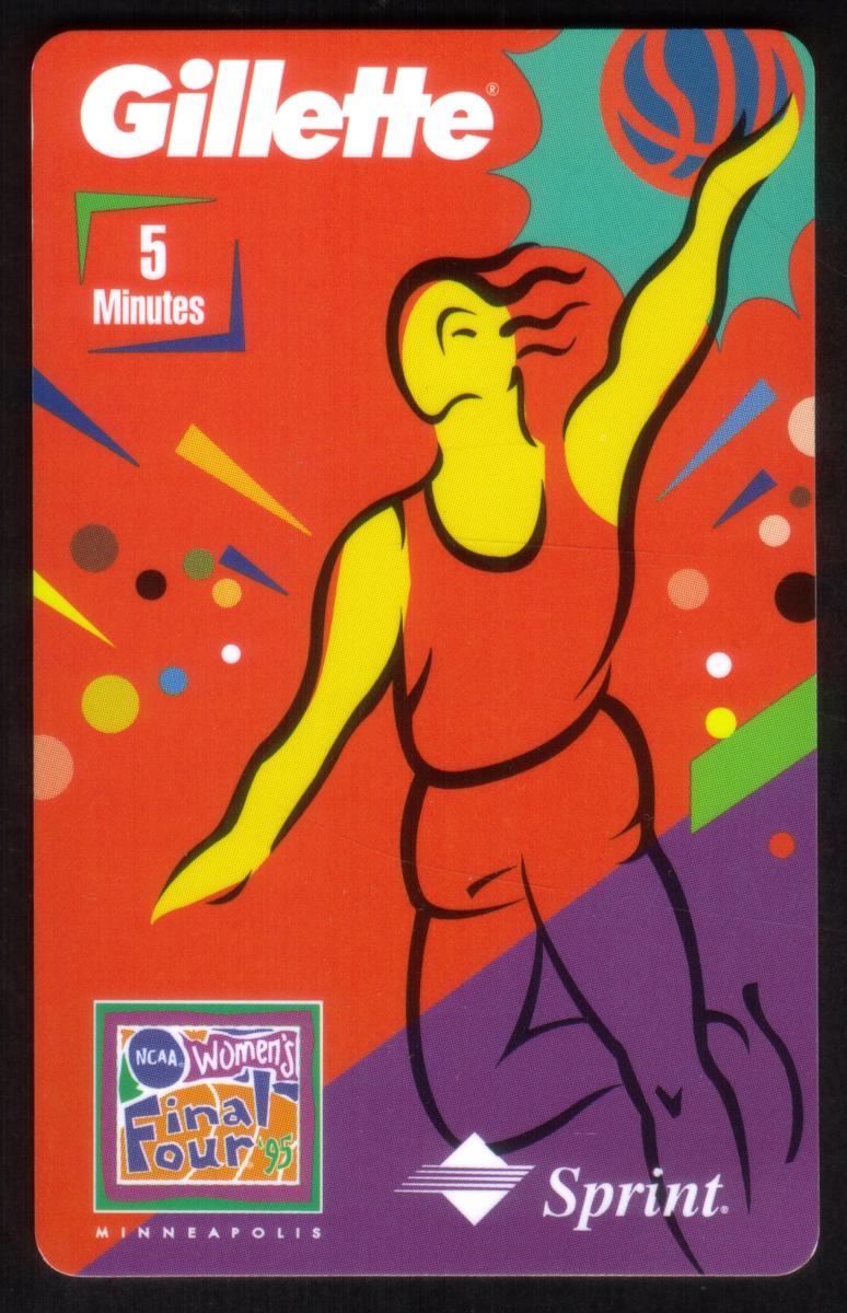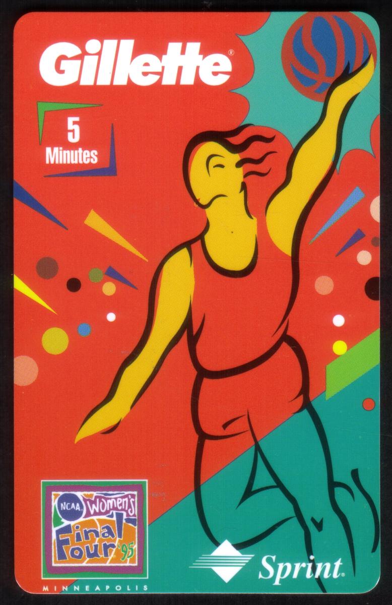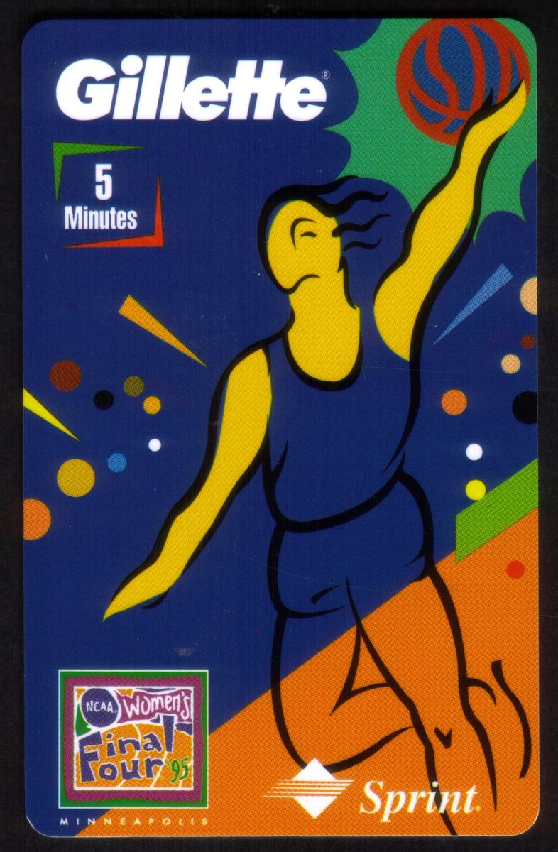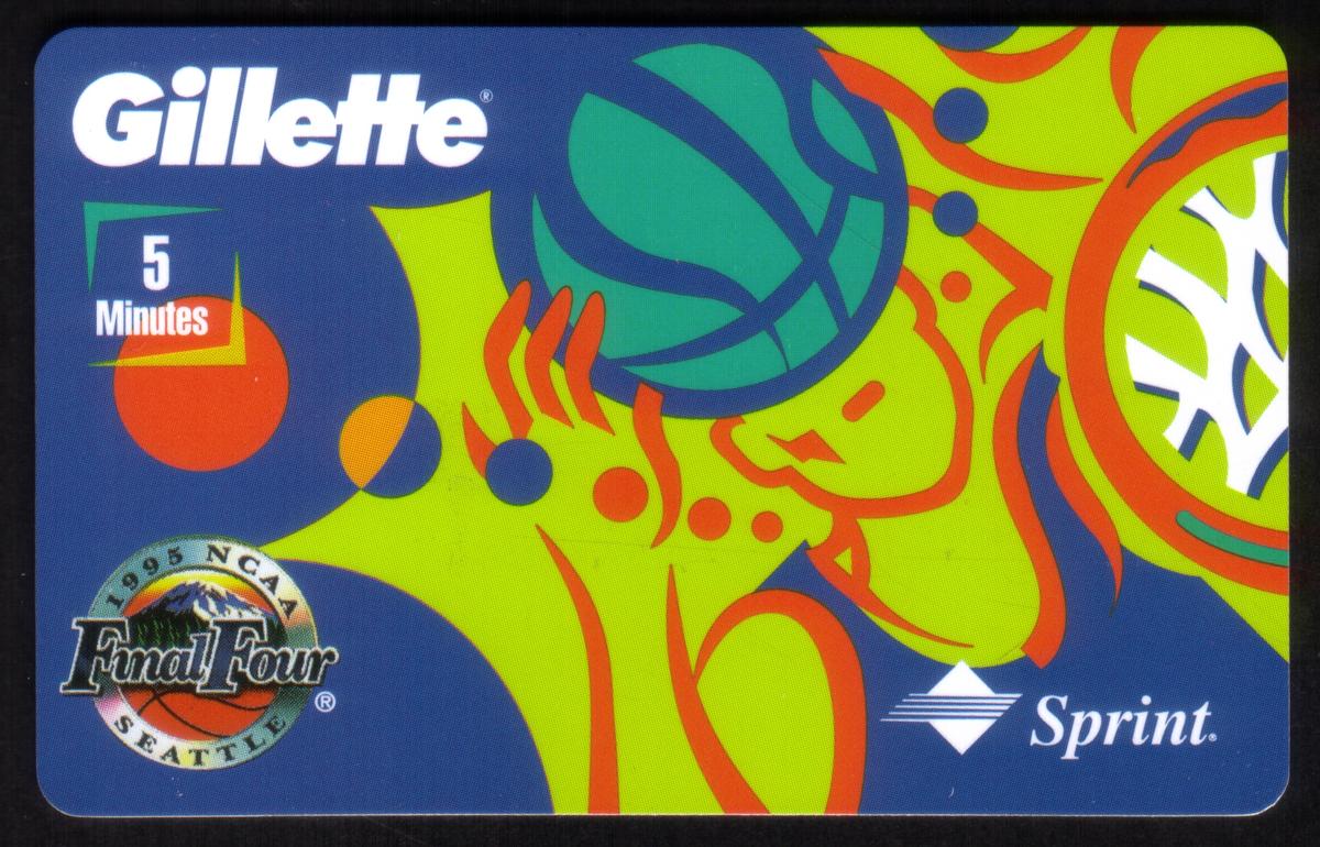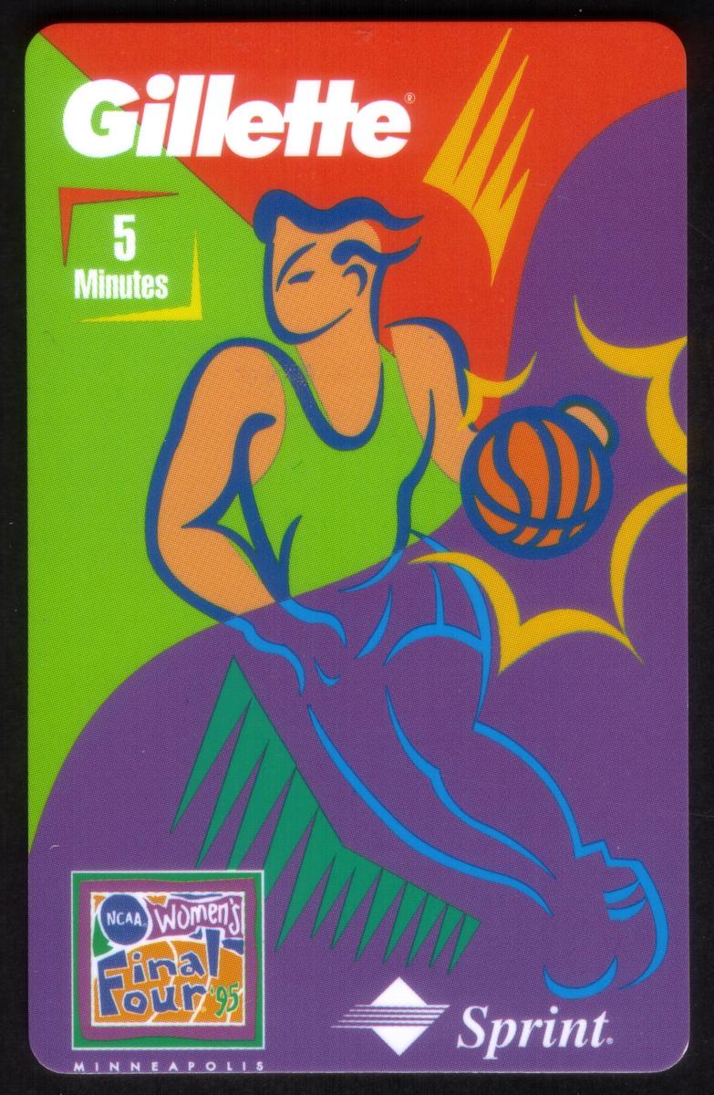 Overall, the card celebrates NCAA basketball through its use of official logos, basketballs, and associated branding from Gillette and Sprint, reflecting a promotional collectible from the mid-1990s focused on college basketball.