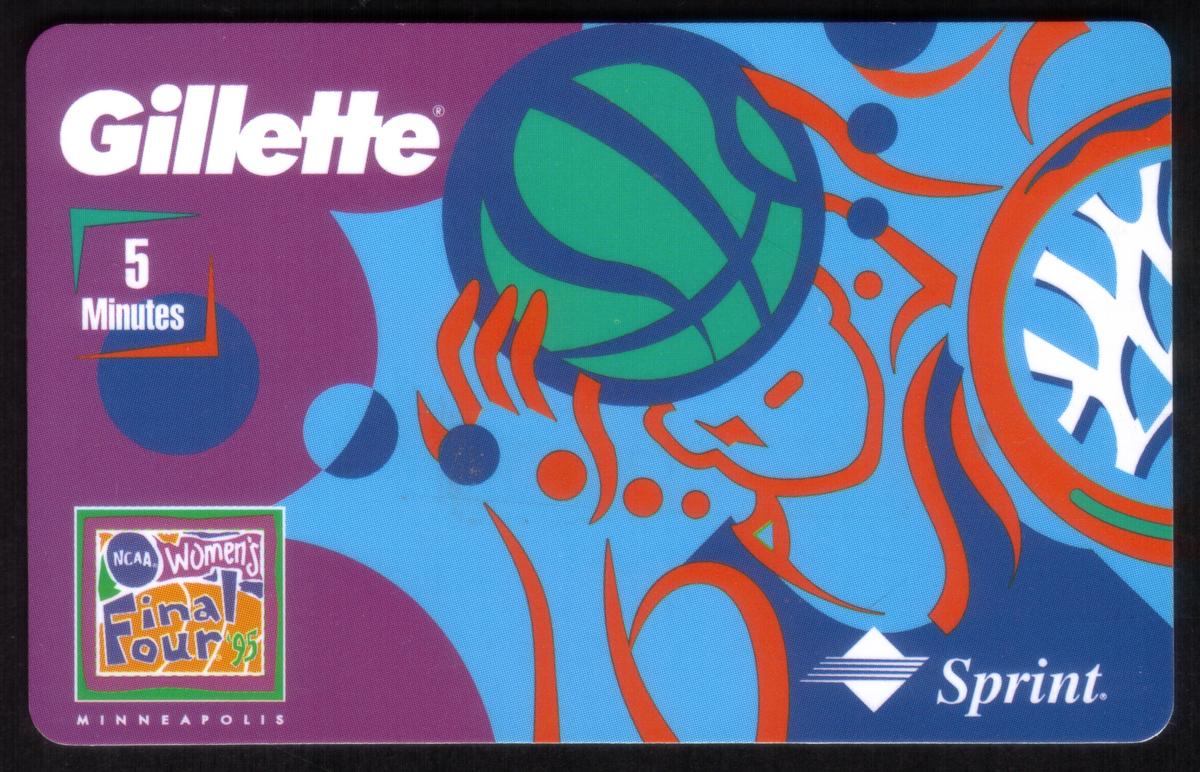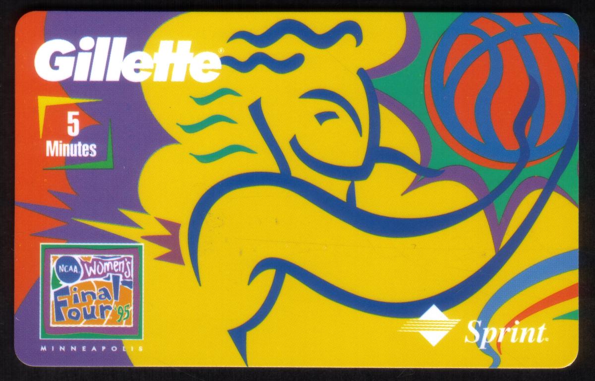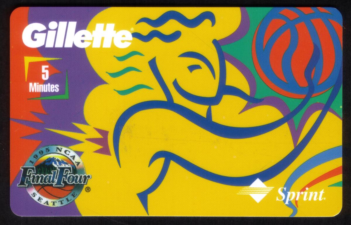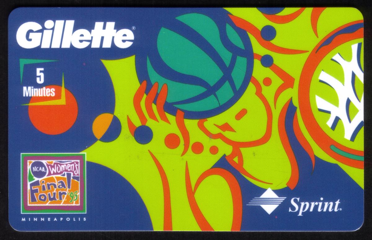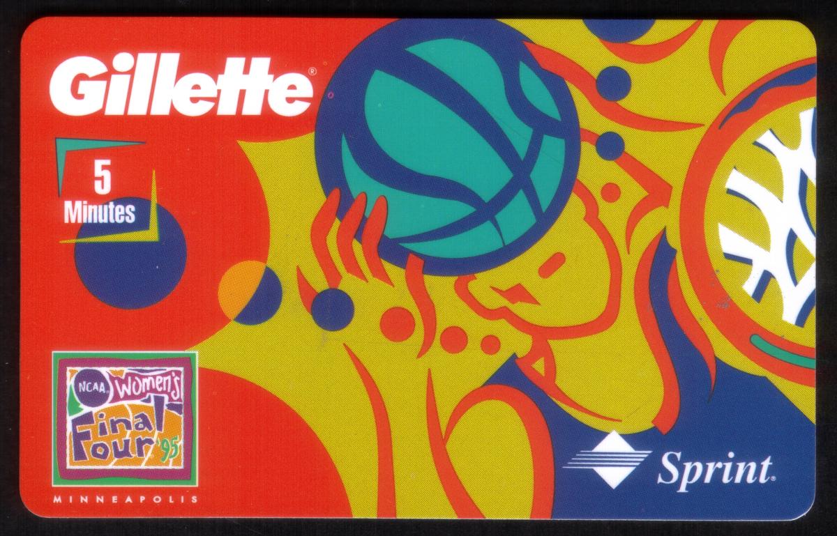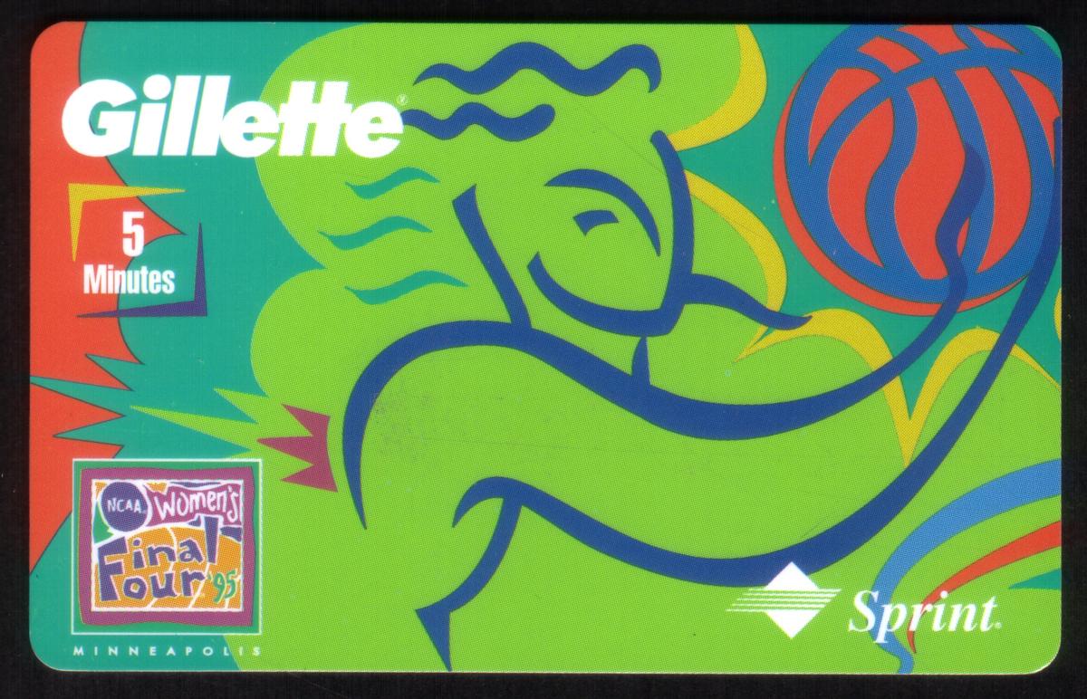 Overall, the card celebrates NCAA basketball through its use of official logos, basketballs, and associated branding from Gillette and Sprint, reflecting a promotional collectible from the mid-1990s focused on college basketball.