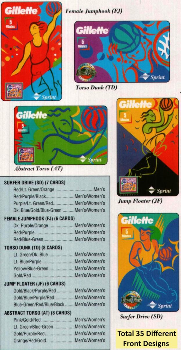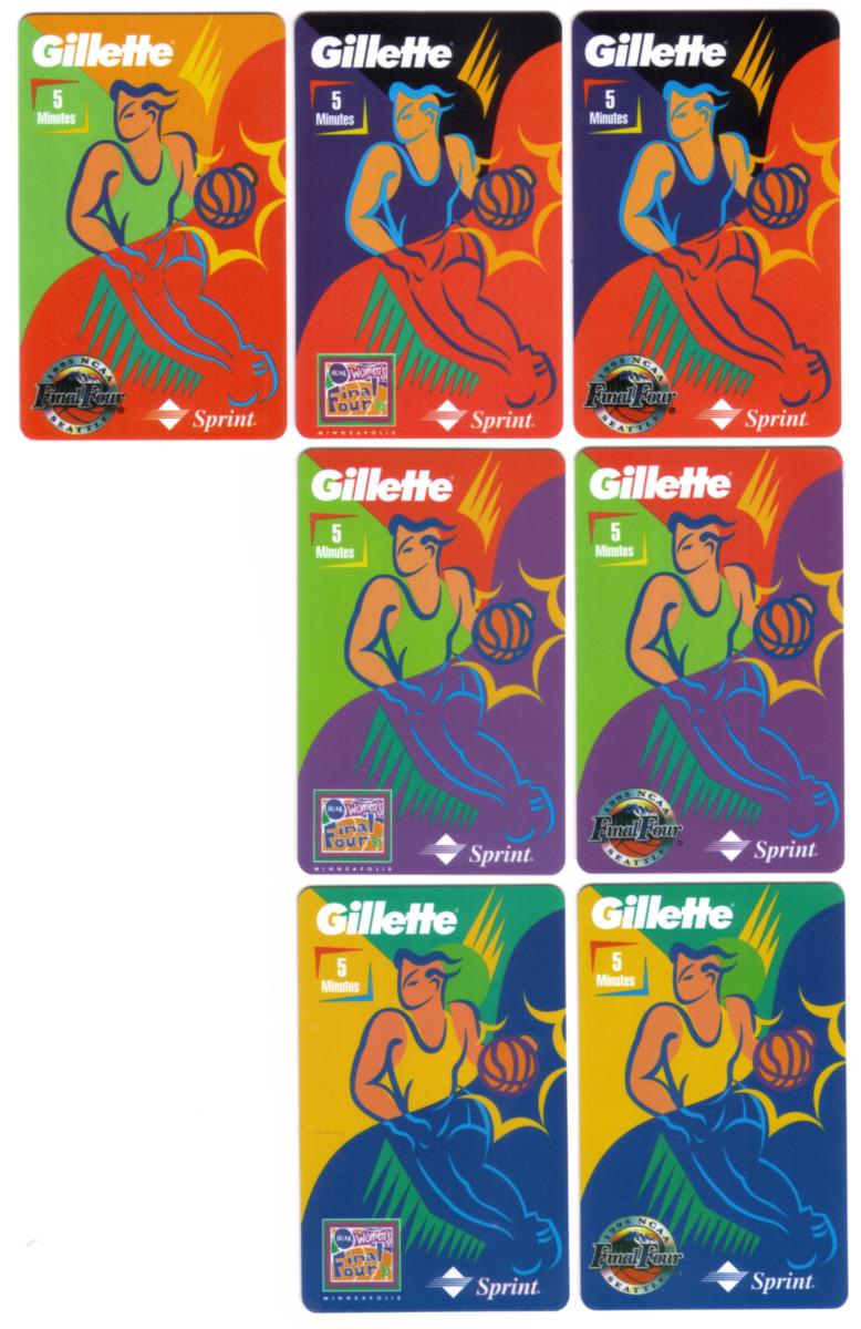 The card is part of a set connected to Gillette and NCAA from the year 1995, specifically noted as a set of 35 different front designs issued by Sprint. The Gillette logo appears clearly, emphasizing the promotional relationship with the NCAA basketball theme. The design balances graphic elements and logos, showcasing basketball imagery in conjunction with corporate branding.