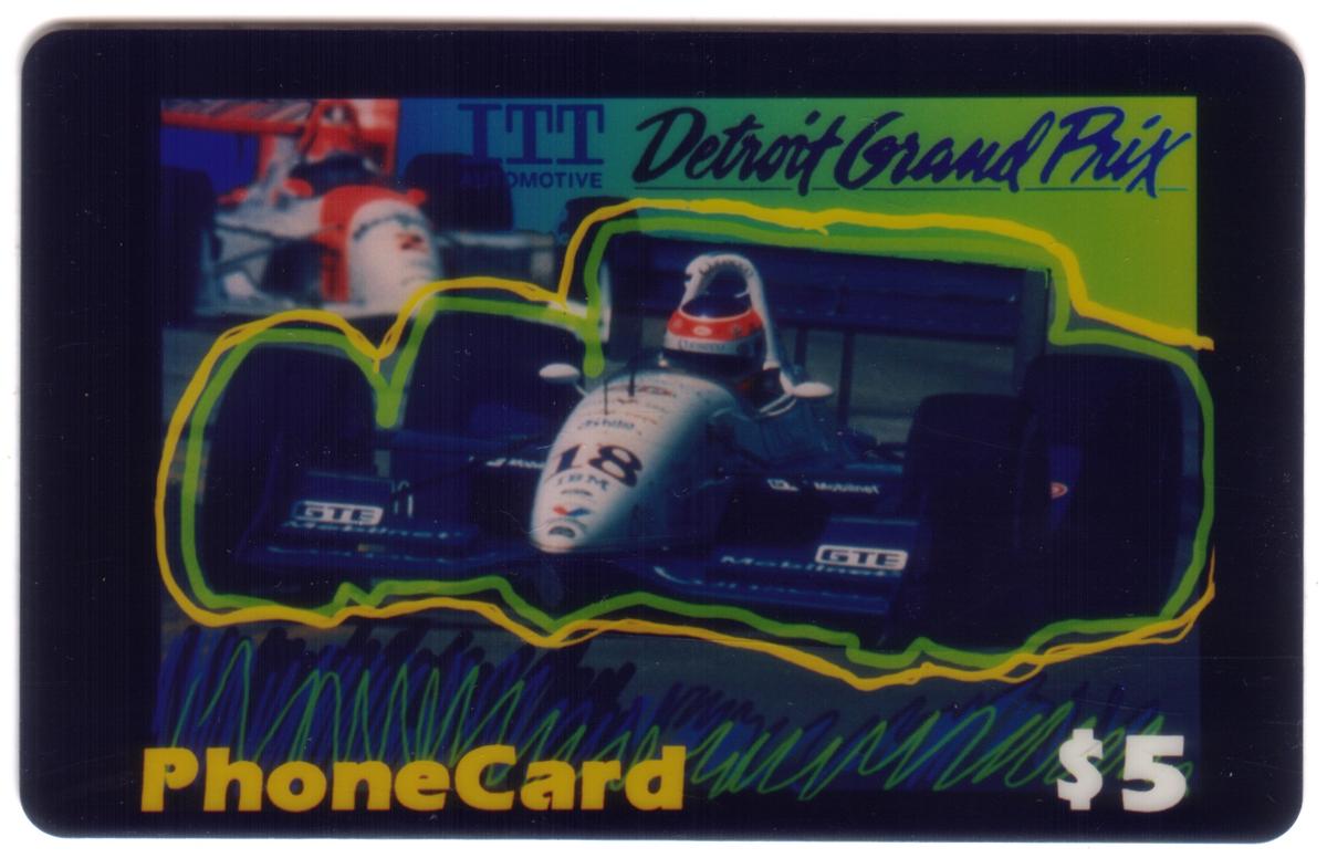 Additionally, the card bears the denomination of $5 and includes the text “LifeSaver Commun,” linking it to collectible phone card series around sports and automotive racing. This $5 denomination and branding establish it as a collectible phone card related to sports and auto racing memorabilia, commemorating the Detroit Grand Prix through authentic automotive imagery and clear textual references.