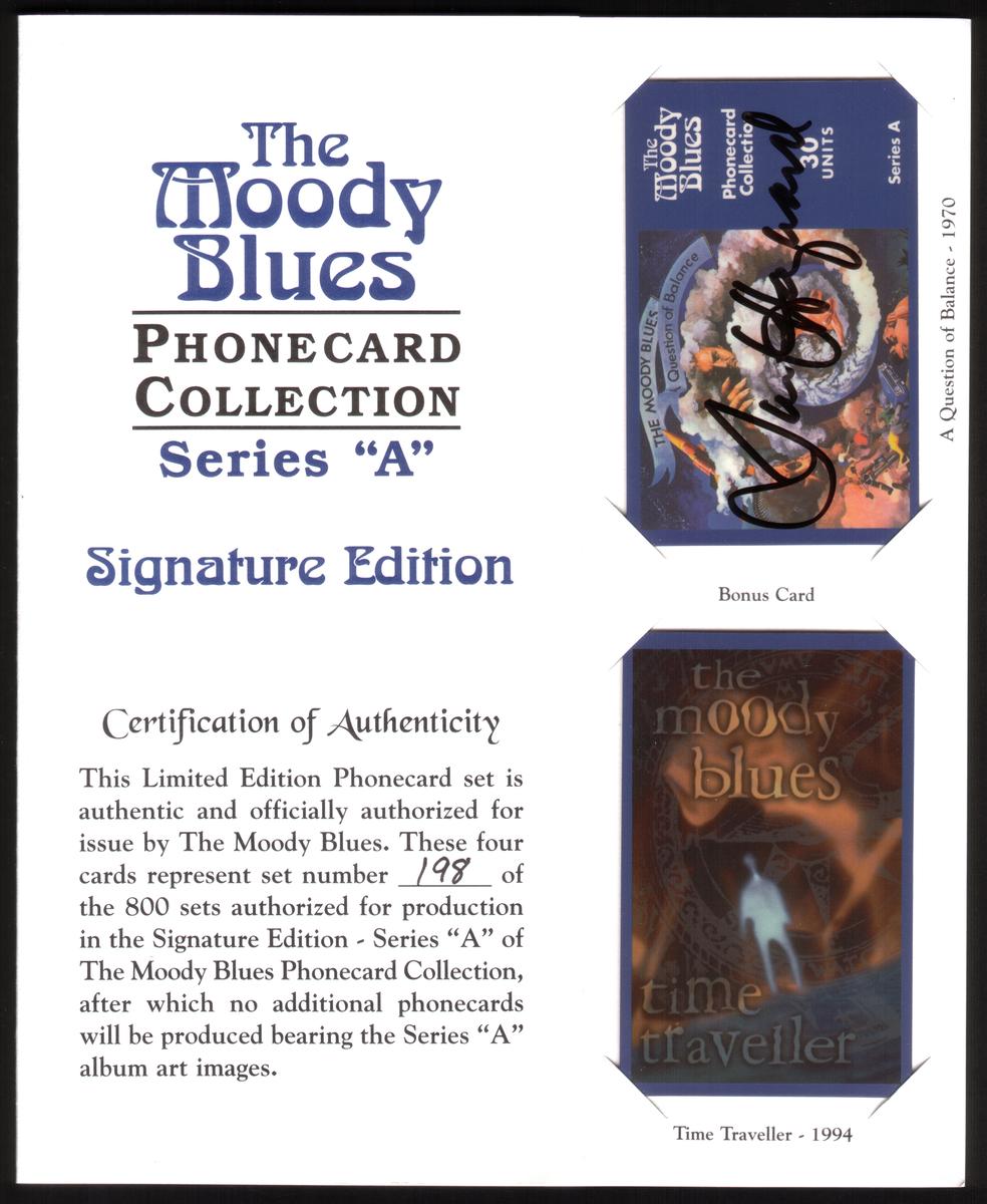 This set is part of Creative Communication's Moody Blues Collector Series 'A' and is presented with consistent design elements across all cards, including a bordered purple background on the right portion containing the text and denominations. The cards reflect a tribute to The Moody Blues’ musical legacy through detailed album-themed visuals and authenticated signatures.