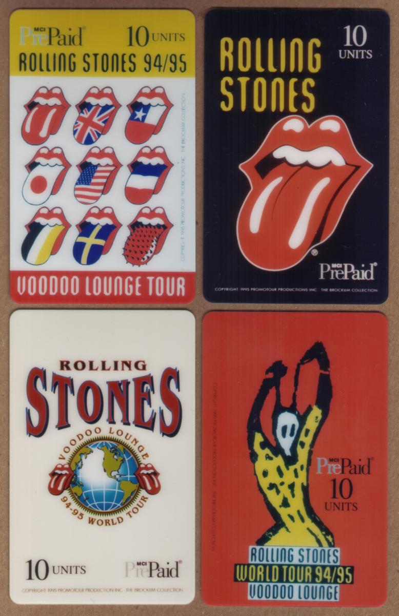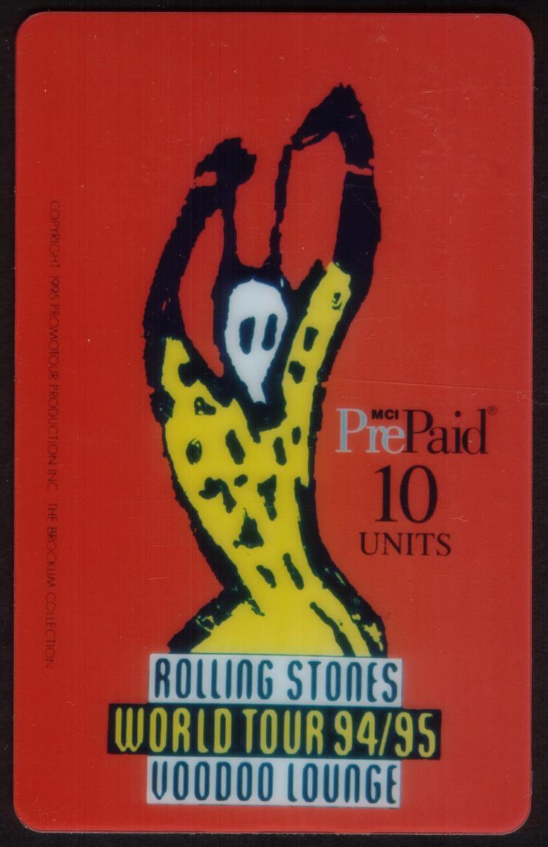 The second card displays a striking illustration of a figure with raised arms in a yellow, black-dotted outfit with a white skull-like face on a solid red background. Below this image, text reads "ROLLING STONES WORLD TOUR 94/95 VOODOO LOUNGE" in a combination of blue, black, and yellow fonts. The card also shows the MCI PrePaid logo and the 10 units value.