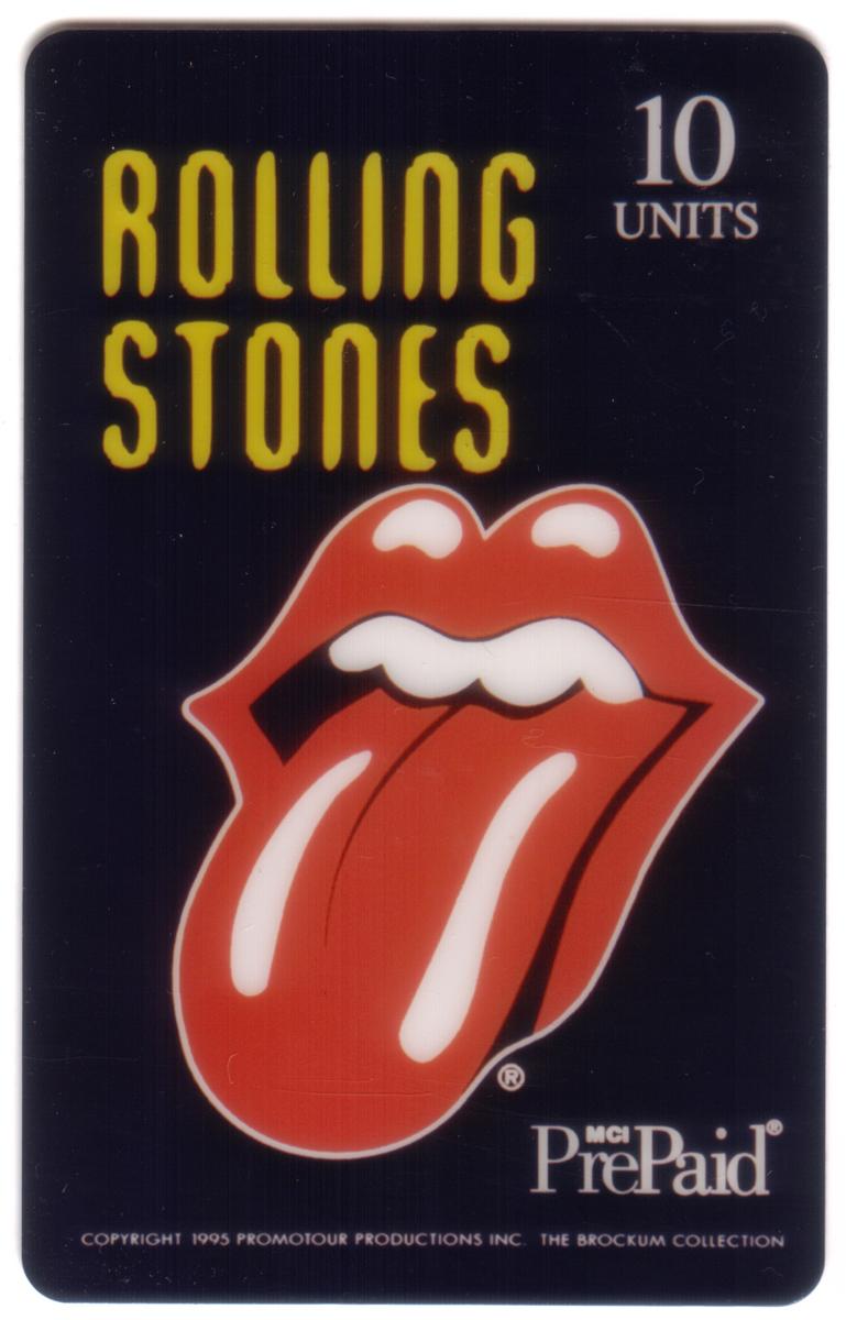 The fourth card shows a simple design with a black background, displaying the large and bold Rolling Stones tongue logo prominently in the lower half of the card. The top left corner has the text "ROLLING STONES" in yellow block letters, and the top right corner states the 10 units value. The MCI PrePaid logo and copyright details for 1995 Promotour Productions Inc. and The Brockum Collection are at the bottom. These cards collectively celebrate the famed band's world tour with distinctive graphics and official branding.