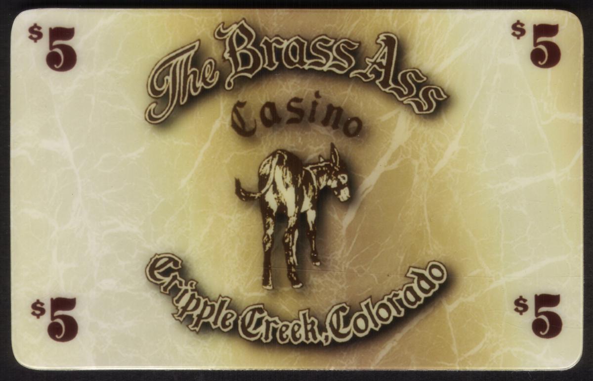 This collectible promotional card commemorates the grand opening of the Brass Ass Casino in Cripple Creek, Colorado. The front of the card prominently features an image of a donkey, representing the casino’s nickname, the "Brass Ass." The donkey is depicted in a detailed and lively manner, positioned centrally against a plain white background.