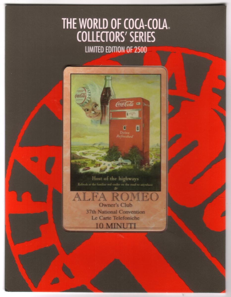 This card merges Coca-Cola branding with the Alfa Romeo Owner’s Club event, capturing vintage Americana travel culture and collectible phone card functionality. The overall impression is nostalgic, with a clear emphasis on Coca-Cola’s role as a roadside refreshment choice during the event.