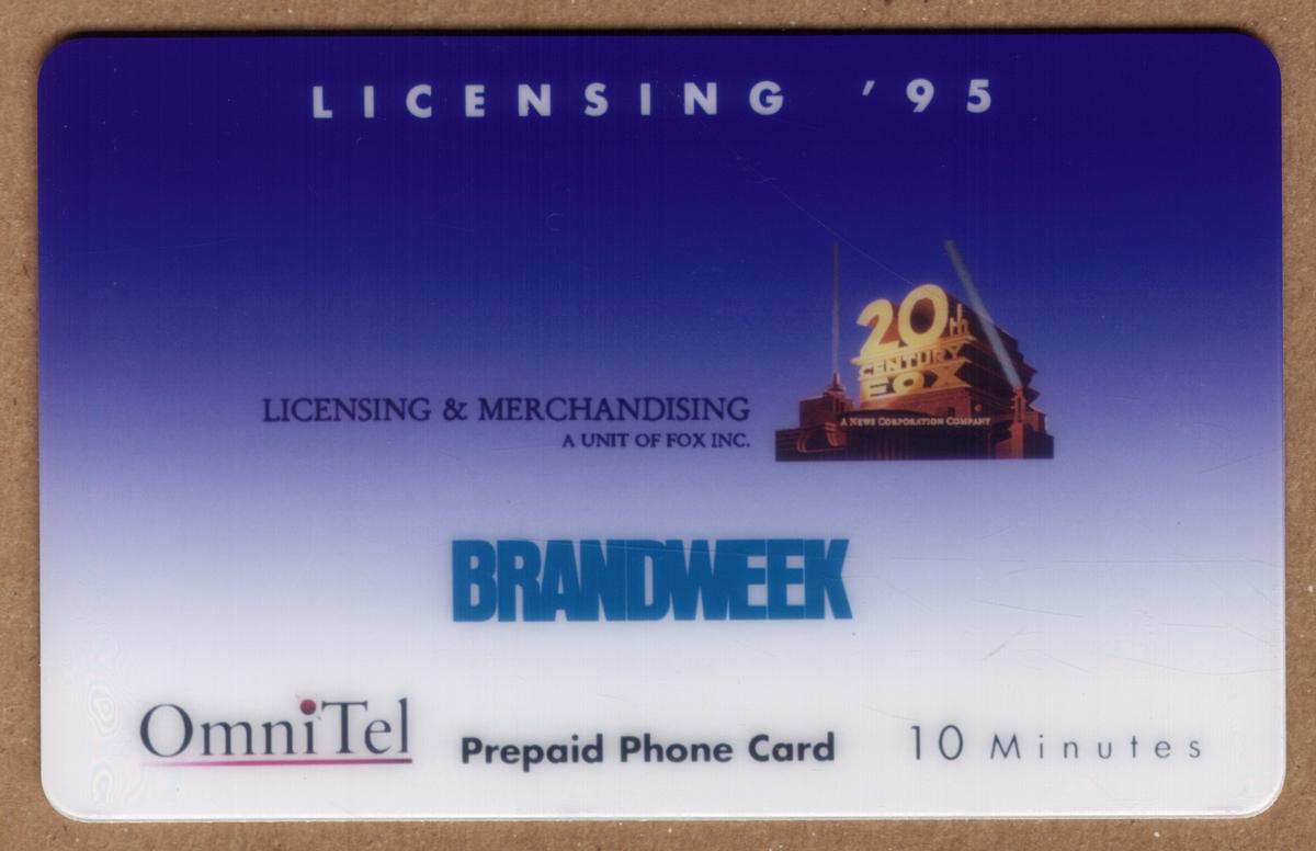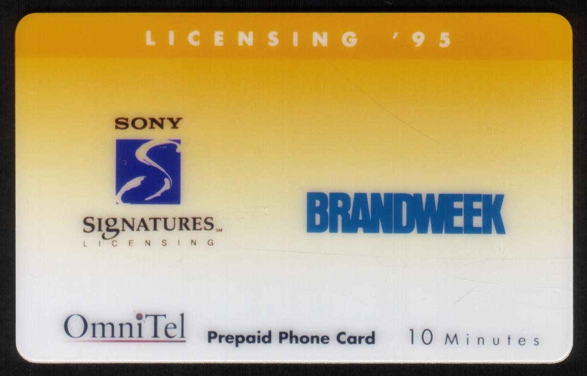Together, these five prepaid phone cards highlight key players in the TV, film, and entertainment licensing business from 1995, including Sony, Turner Home Entertainment, and 20th Century Fox, all under the Brandweek Magazine licensing banner. Each card provides 10 minutes of prepaid phone time and presents a collectible look for enthusiasts interested in the intersection of entertainment and licensing industries.