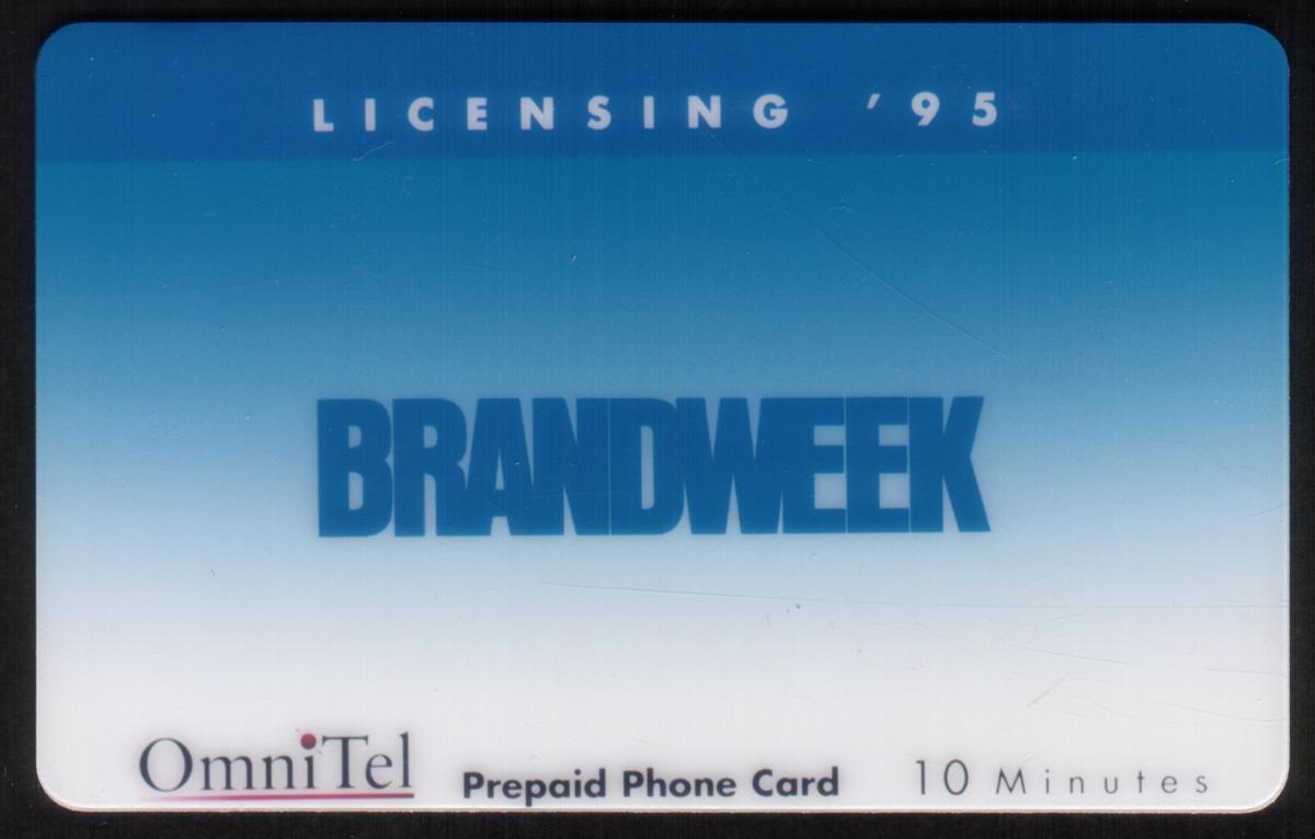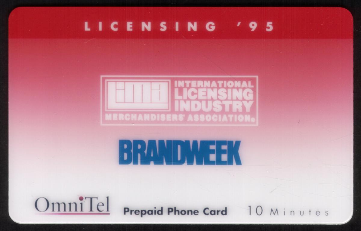 This set of five collectible prepaid phone cards from OmniTel features a “LICENSING ’95” theme and celebrates Brandweek Magazine alongside several major entertainment and film industry brands. Each card has a distinctive top color fade effect with the text "LICENSING ’95" centered near the top. The lower portion of each card features a white background with the OmniTel logo, the words "Prepaid Phone Card," and "10 Minutes" indicating the card's allotted usage time.