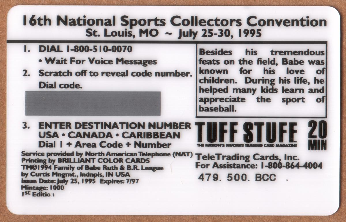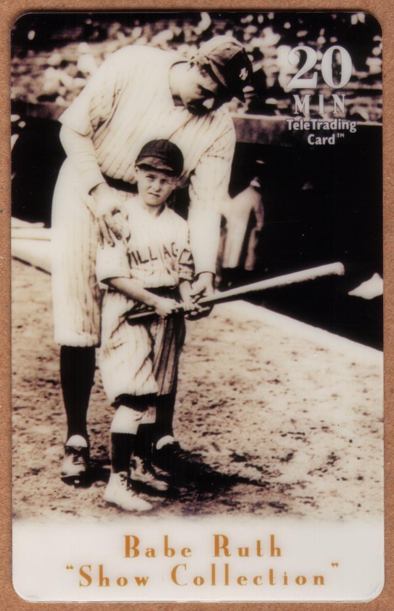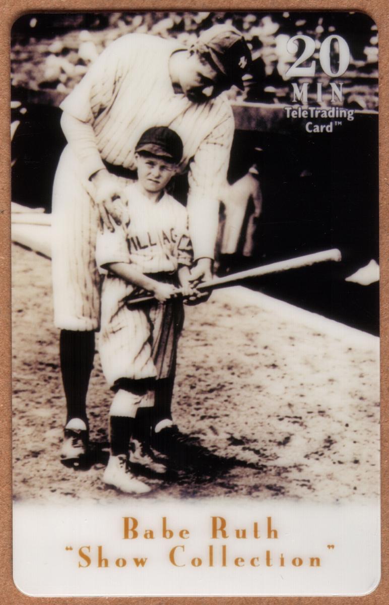 These collectible phone cards form a set of three from the "Babe Ruth Show Collection," issued by TeleTrading Cards Inc. Each card has a value of 20 minutes and features iconic black and white photographic images related to Babe Ruth, a legendary baseball player. The first card shows Babe Ruth instructing a young boy in a "Millage" baseball uniform on how to hold a bat properly, capturing a tender moment on the baseball field. The boy is dressed in traditional early 20th-century baseball attire, including a cap, knee-high socks, and cleats.