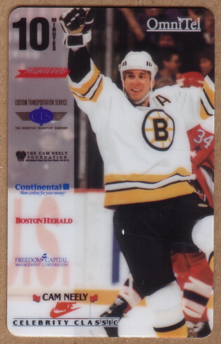 This collectible phone card features imagery related to the sport of hockey and the National Hockey League (NHL). The card prominently includes the name Cam Neely, a well-known NHL player, along with the branding of Nike and the Cam Neely Foundation. Multiple small corporate logos appear throughout the card, including Michelob beer, Continental Airlines, the Boston Herald, OmniTel, the executive transport company, freedom capital management 10m, and WorldCom. The card is associated with the "10m Cam Neely / Nike Celebrity Classic," signifying a connection to a charity or celebrity hockey event.
