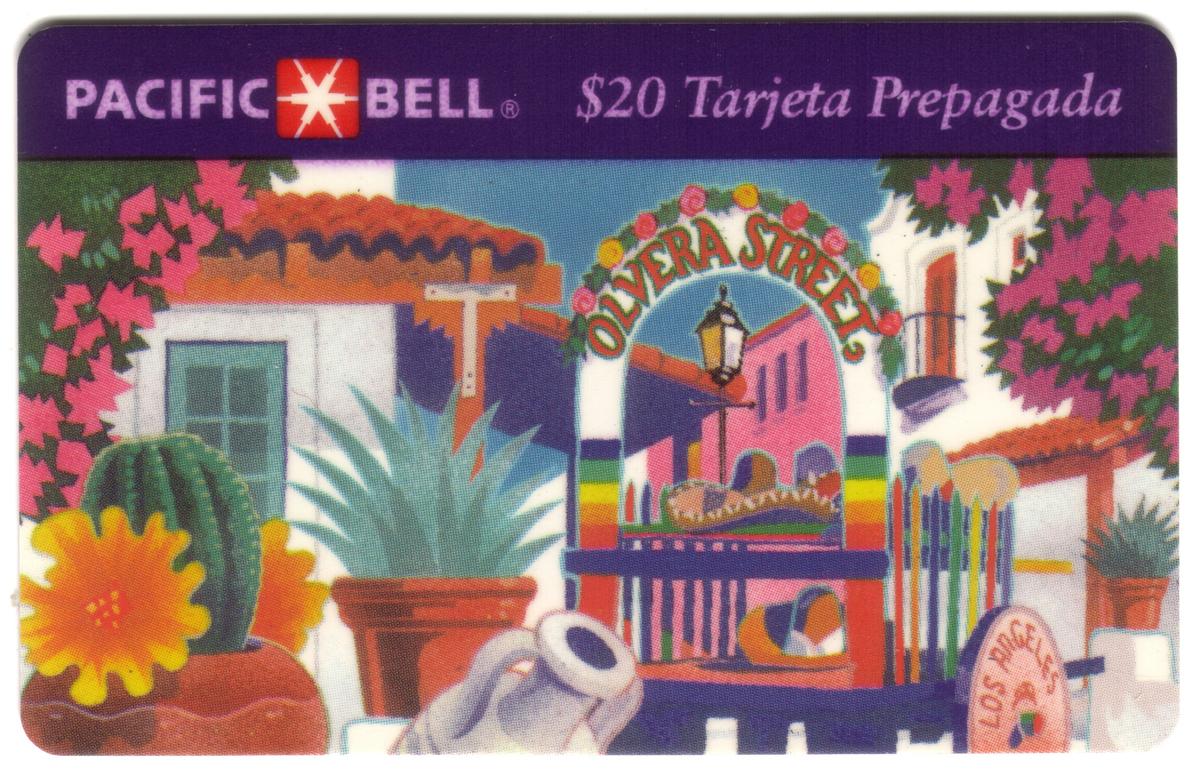 Vibrant Olvera Street scene on a $20 prepaid Pacific Bell phone card featuring colorful artwork, Spanish language, and cultural imagery. |