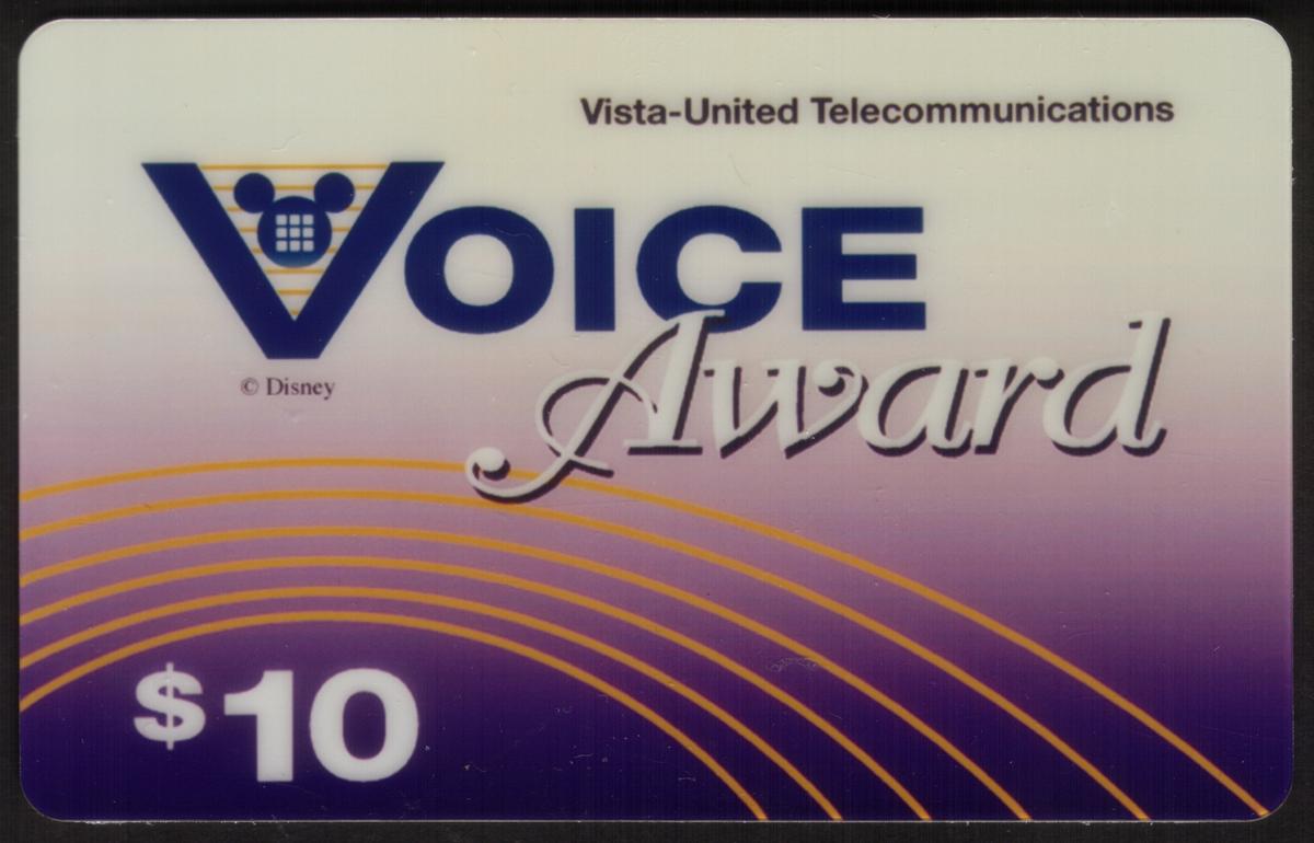 This card is identified as a $10 Disney Voice Award Complimentary Promotion specimen issued by Vista-United, connected to Walt Disney World, Walt Disney Land, and Disney animation themes. It reflects a Disney-themed telecommunications collectible with strong branding elements linked to the animation and amusement park industry.