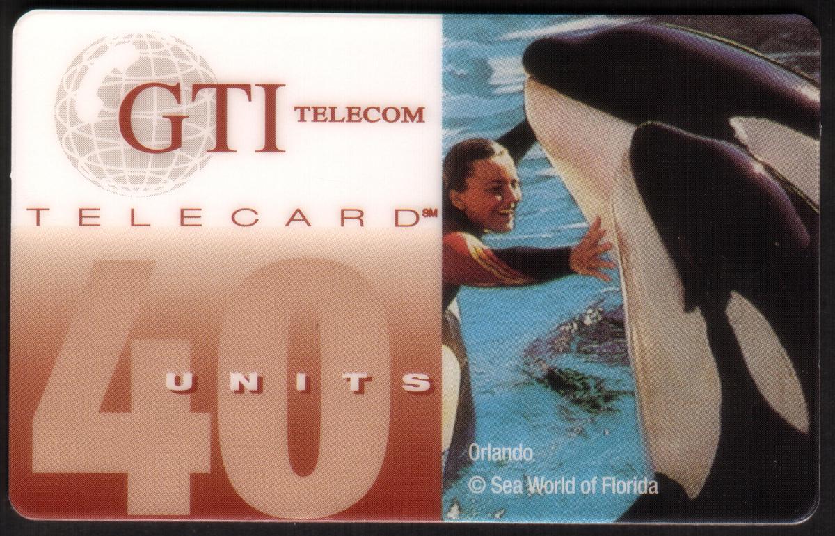 Prepaid phone card featuring GTI TELECOM branding, a bold 40-unit design, and a SeaWorld Orlando orca scene, with usage details on the back. |
