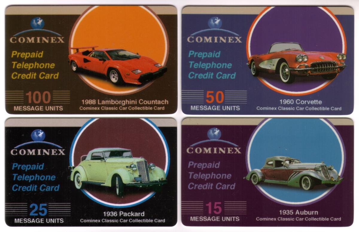 These four COMINEX prepaid telephone credit cards feature collectible classic car designs from different years and manufacturers. Each card has a distinct colored background within a circle, a classic automobile image, and details about the car model and year. The COMINEX logo and the words "Prepaid Telephone Credit Card" are on the left side of each card, along with the number of message units available.