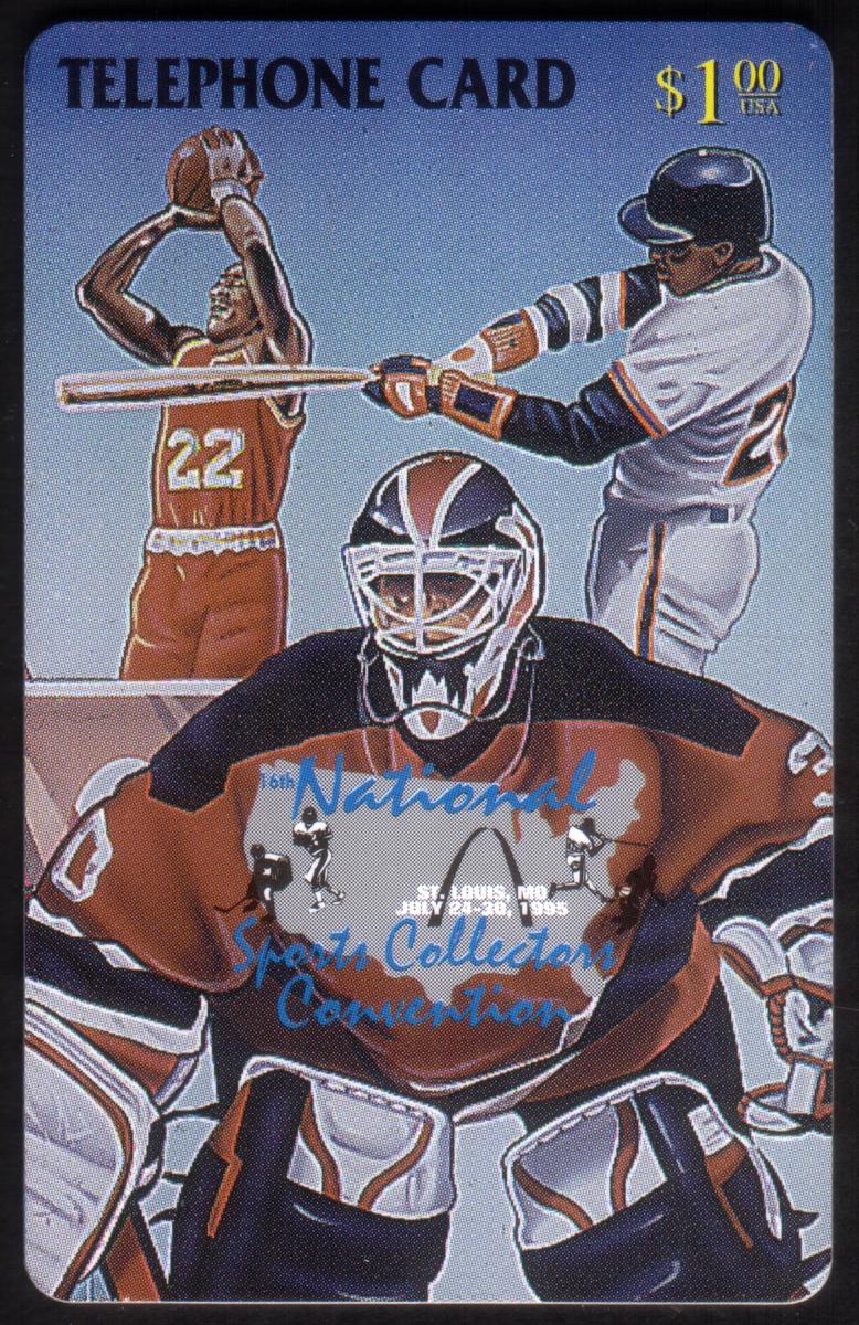 These two collectible telephone cards, each valued at $1.00 USA, were issued for the 16th National Sports Collectors Convention held in St. Louis, Missouri, from July 24 to 30, 1995. They form a set of two cards designed as a puzzle, produced by Mercury Marketing MMC under Planet Telecom. Both cards prominently display the iconic St. Louis Arch in the background, establishing the location of the event.