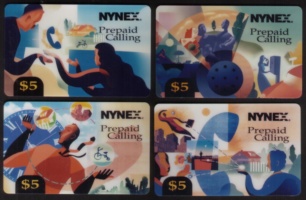 These four collectible prepaid calling cards from NYNEX each have a $5 denomination and feature modern art designs full of vibrant colors and abstract shapes that reflect everyday life and communication themes.