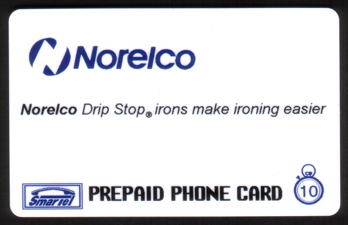 This card is a collectible telephone card related to corporate promotions and homemaking appliances, specifically irons from Norelco, with no additional imagery or characters present. The card adheres to a straightforward design emphasizing brand names and trademarks exclusively.