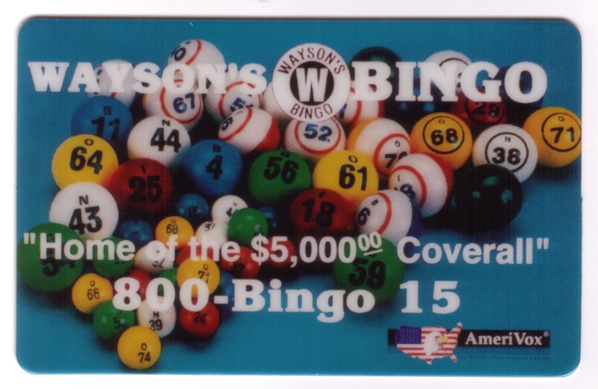 White text on the card reads: "Home of the $5,000.00 Coverall" and "800-Bingo 15," highlighting the promotional prize and contact phone number associated with Wayson's Bingo. In the lower right corner, the AmeriVox logo appears, featuring a stylized American flag alongside the brand name.