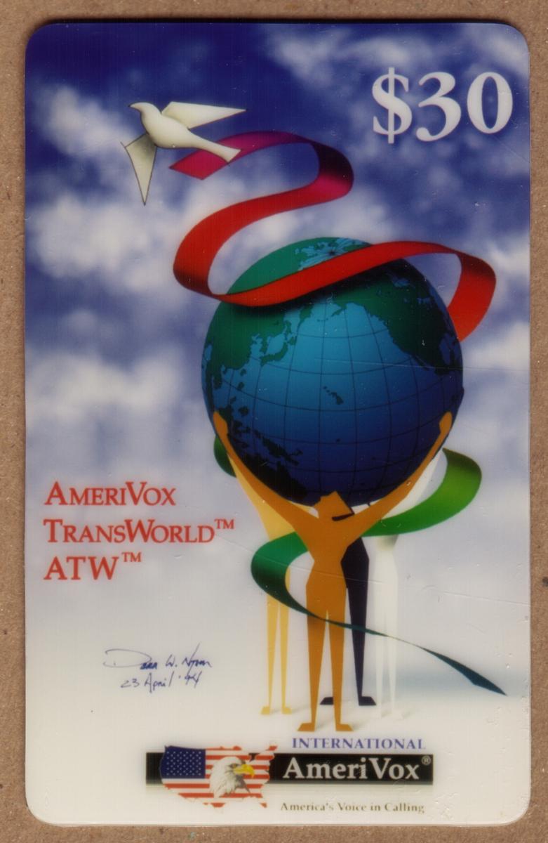 The card’s face value of $30 is prominently displayed in the upper right corner. On the left, text in red reads “AmeriVox TransWorld ATW,” identifying the issuer and series. Below the image near the bottom right, there is a small signature of Dana W. Nyson dated ’84, authenticating the artistic contribution. At the bottom, the International AmeriVox logo includes an American flag and the tagline “America’s Voice in Calling.”