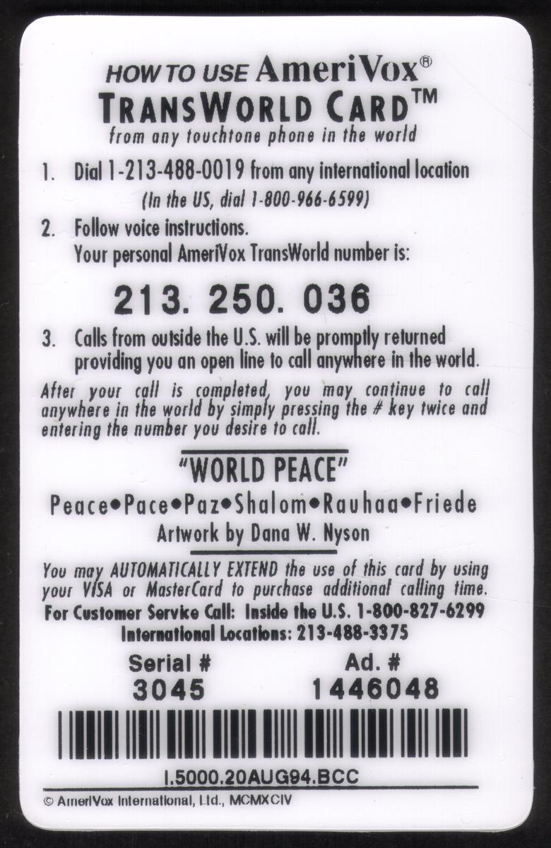 Since we have the world's largest inventory of USA phonecards for collectors, you will not necessarily receive the identical serial/batch/PIN number that we have scanned/pictured.