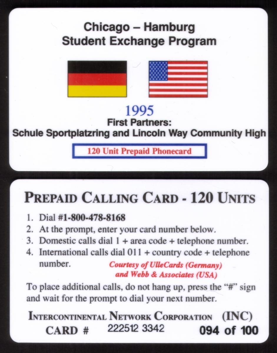The card is identified as a chip card used for telecommunications purposes, with a unit value of 120 indicated. The names Lincoln Way Community High School and Schule Sportplatzring are clearly printed on the card, reinforcing the card’s focus on the educational and cultural exchange program. The overall presentation highlights the significance of international student relationships between Germany and the United States during 1995.