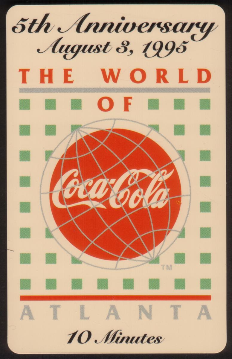 This set of two collectible phone cards commemorates the 5th Anniversary of the World of Coca-Cola in Atlanta, dated August 3, 1995. Both cards display the official Coca-Cola logo prominently. The first card has a cream-colored background with the words "5th Anniversary August 3, 1995" scripted at the top, followed by "THE WORLD OF" in bold red capital letters. Below this text is the classic red Coca-Cola logo encircled by a stylized globe with green squares scattered in the background. At the bottom is the word "ATLANTA" in light gray capital letters, along with "10 Minutes" signaling the card's usage value.