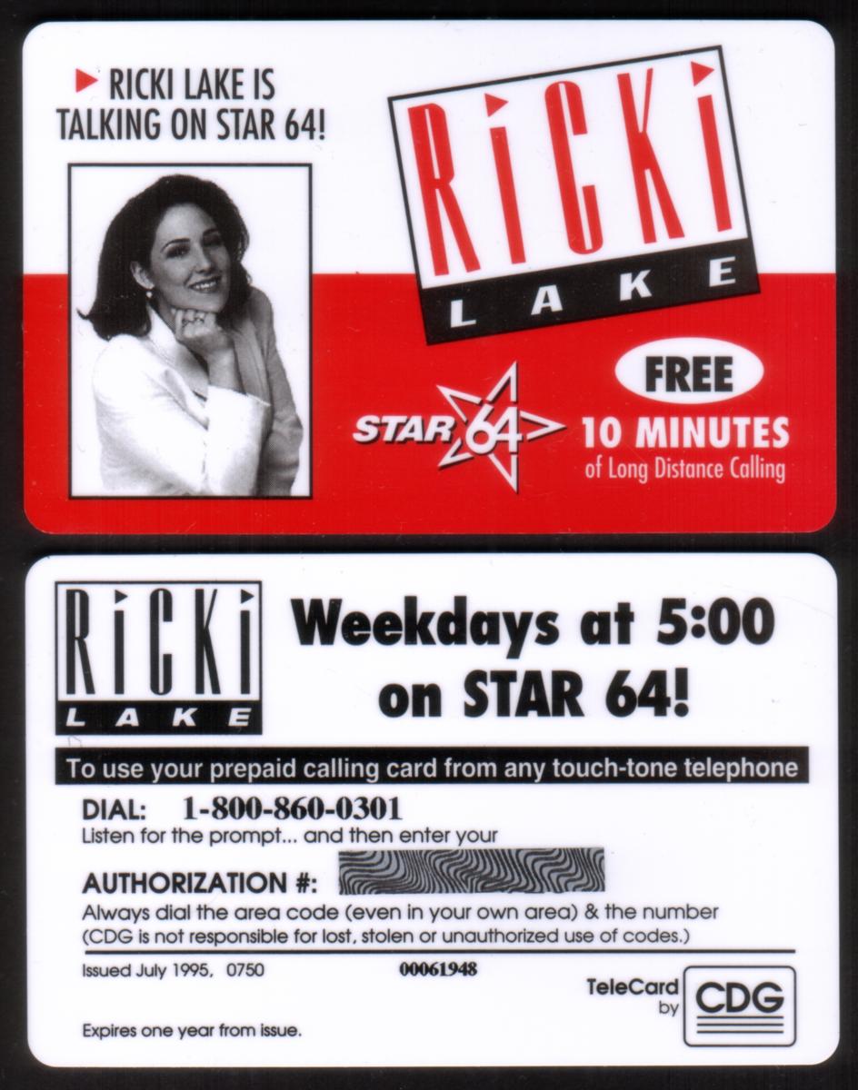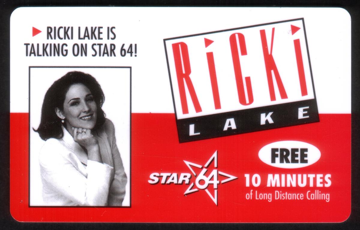Overall, the card is clearly themed around Ricki Lake and the Star 64 phone service, offering collectible value related to entertainment, famous people, television talk shows, and movie stars. The clean layout and use of red, white, and black colors emphasize the promotional nature of this phone card.