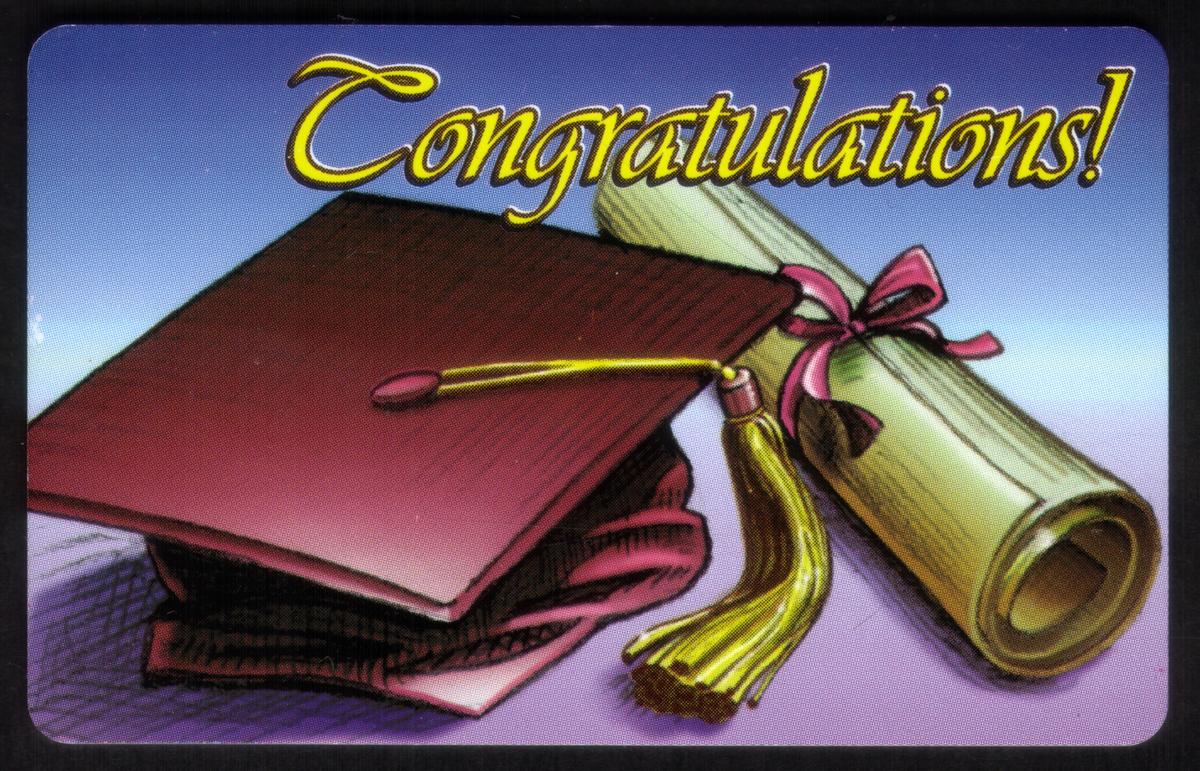 This card highlights themes of greetings, celebration, education, diplomas, and graduations. It embodies a festive and formal tone suitable for honoring important educational accomplishments. The visual details are clean and formal, aligning well with congratulations and milestone celebrations related to school and education in 1995.