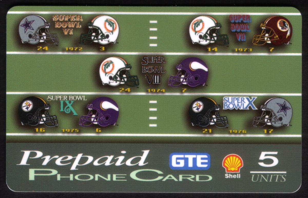 Each card contains standard prepaid phone card branding at the bottom stating "Prepaid Phone Card," with the blue GTE logo, the red and yellow Shell logo, and the denomination of 5 units. The set provides a visual history of early Super Bowls through detailed helmet imagery and color-coordinated graphics with scores and dates, making it significant for both football fans and collectible phone card enthusiasts.
