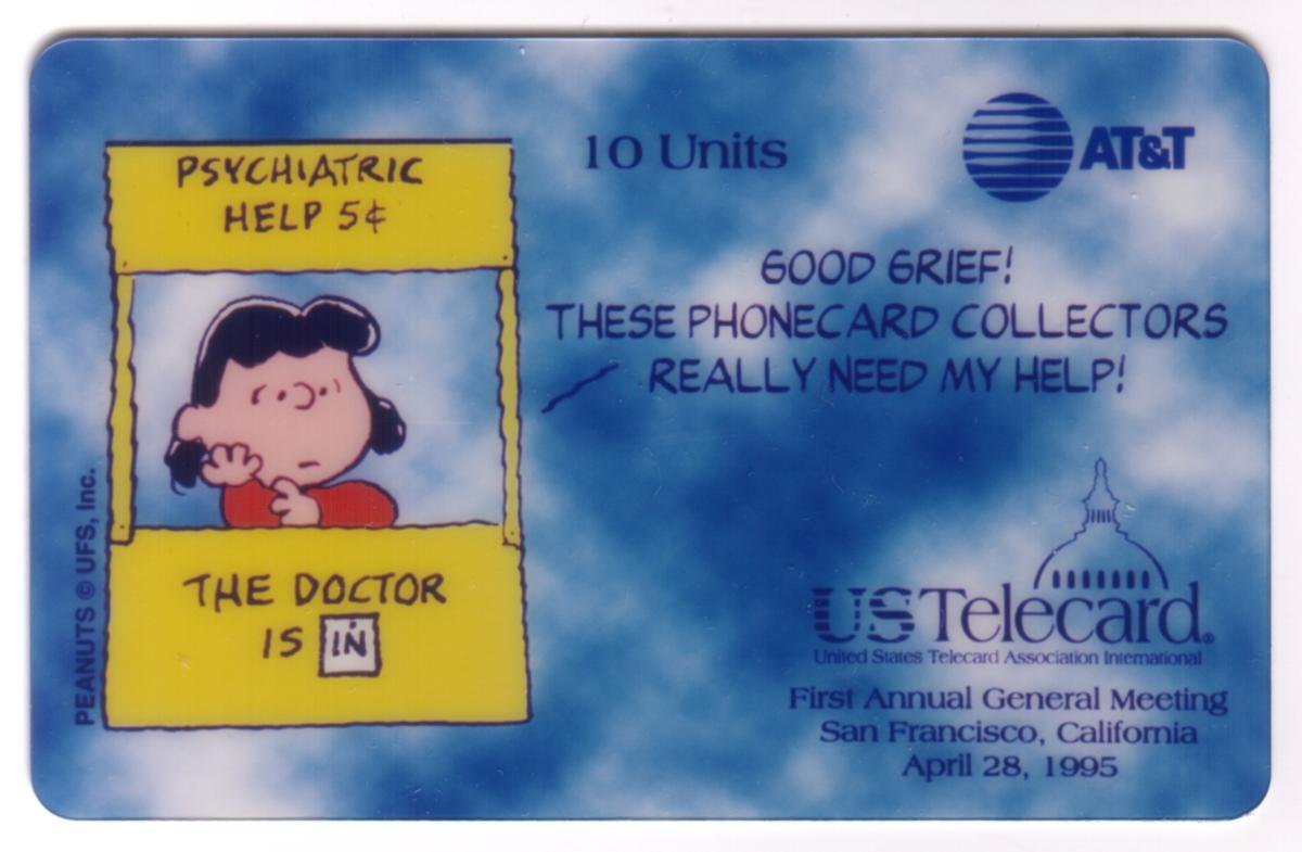 This phone card commemorates the USTA's first annual general meeting held in San Francisco in 1995 and features artwork by Charles Schulz from the Peanuts comic strip series. Lucy’s psychiatric help booth and phrase “The Doctor is IN” are classic elements from the Peanuts cartoons.